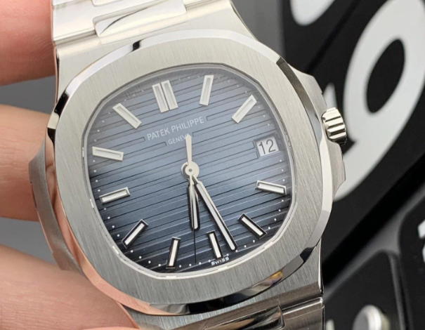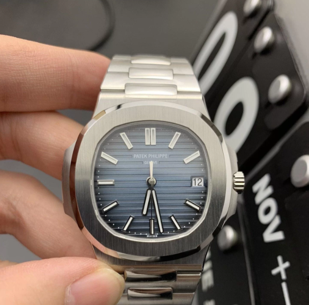 文字盤は深みのあるブルーに水平ストライプ模様。光の角度によってグラデーションが美しく輝き、まるで海面を思わせる幻想的な表情を見せます。インデックスはシンプルなバー型で、夜光塗料入り。暗い場所でもくっきり見える実用性も抜群です。 3時位置の日付窓は完璧に再現され、12時位置には「PATEK PHILIPPE」の刻印が堂々と輝きます。 ケースとブレスレットの仕上げは、鏡面ポリッシュとサテンブラシのコントラストが絶妙。高級感が溢れ、手首に巻いた瞬間に「自分は特別な時計を持っている」と実感できます。