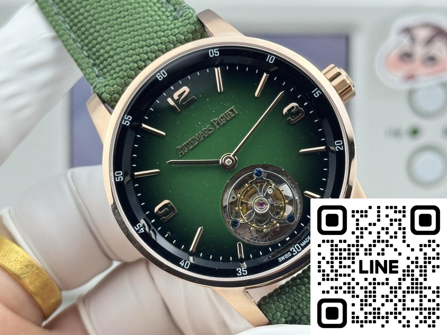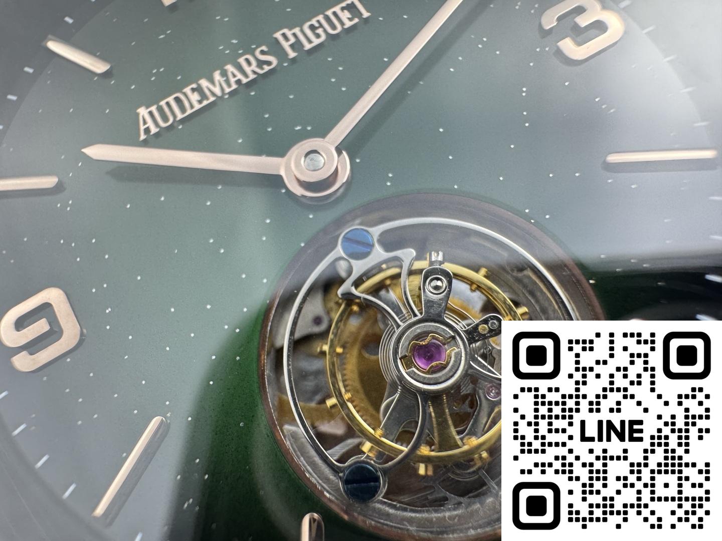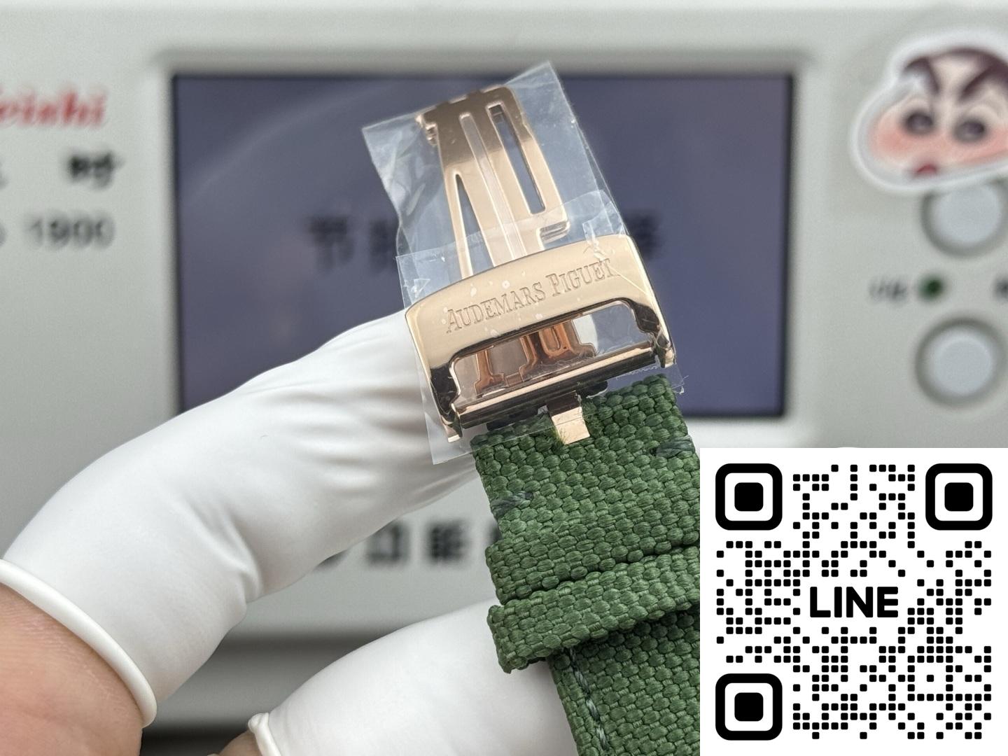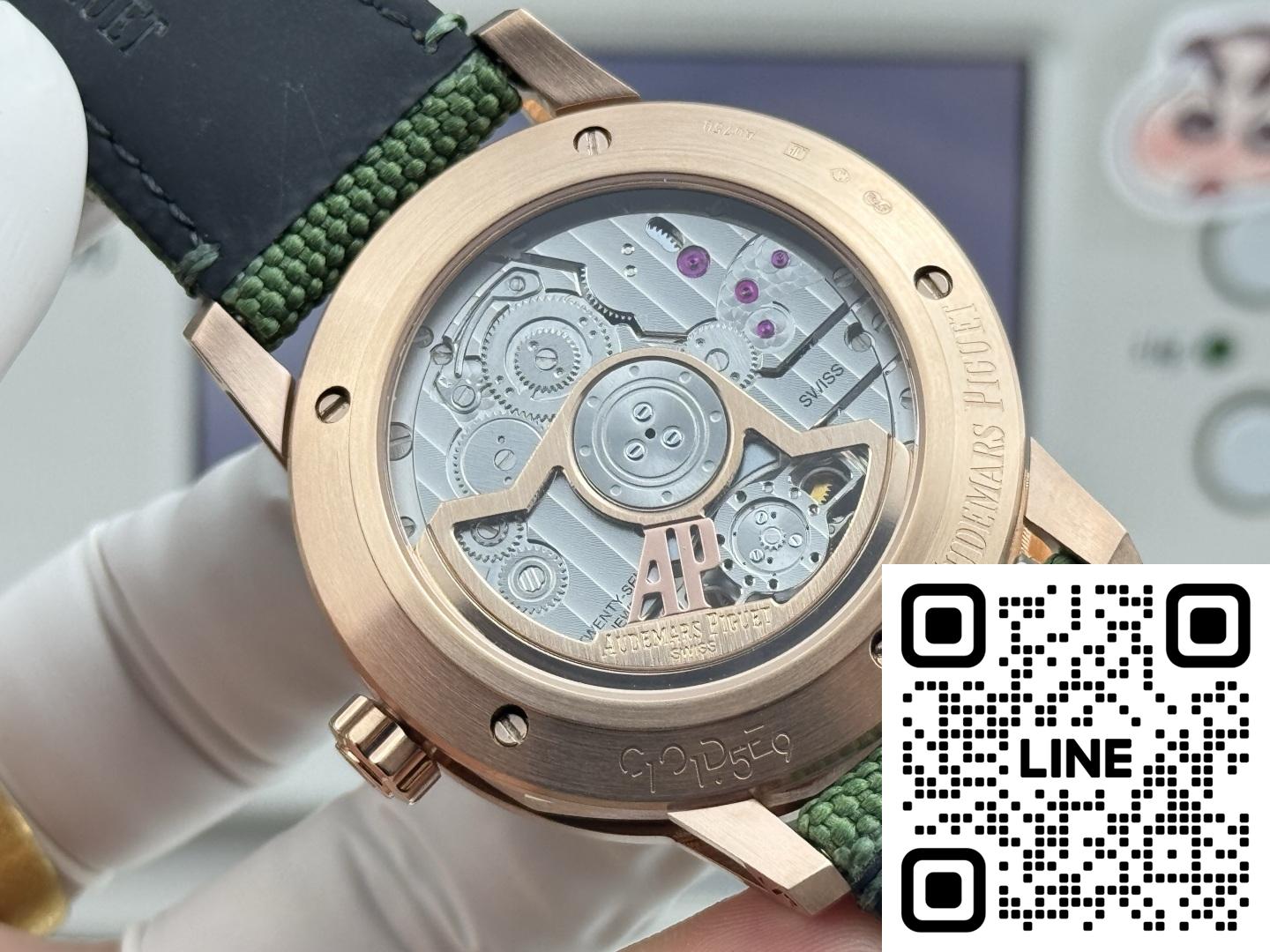 オーデマ・ピゲ 26396NR.OO.D002KB.01は、エレガンスと確かな機能を兼ね備えた、非常に印象的な時計です。まず、機械式ムーブメントを搭載しており、伝統的な時計製造の職人技を高く評価する方にとっては常に嬉しい仕様です。文字盤はスモークグリーンとアベンチュリン素材が際立ち、独特の星空のような外観を演出しています。インデックスと針はピンクゴールド製で、全体のデザインにエレガントな雰囲気を添えています。ストラップはブラックのミックスラバーとテキスタイルのコンビネーションで、快適で耐久性に優れています。