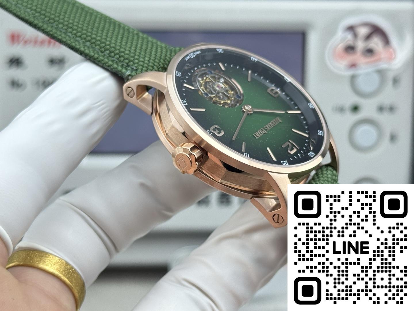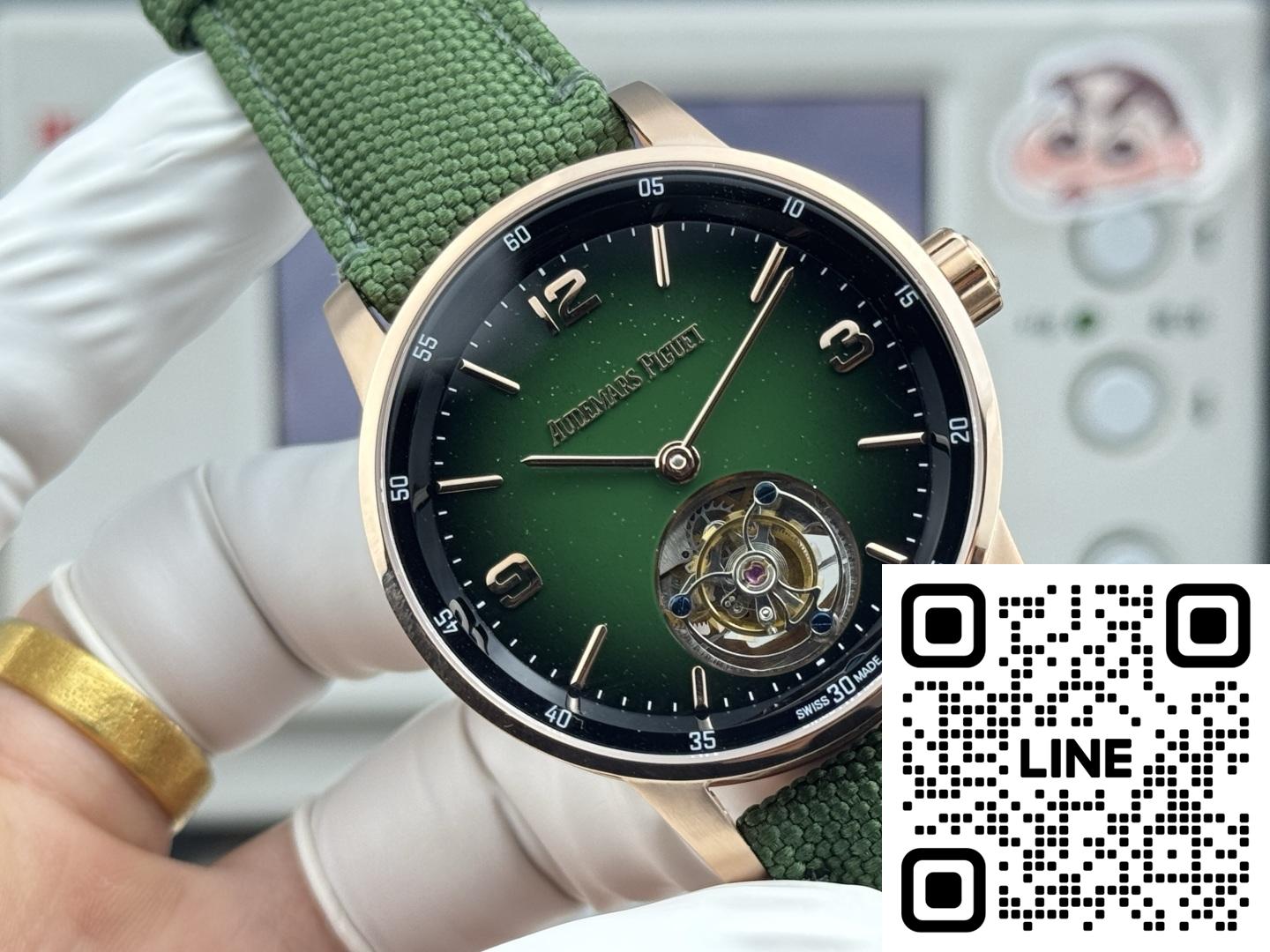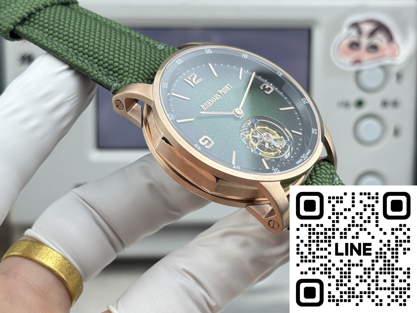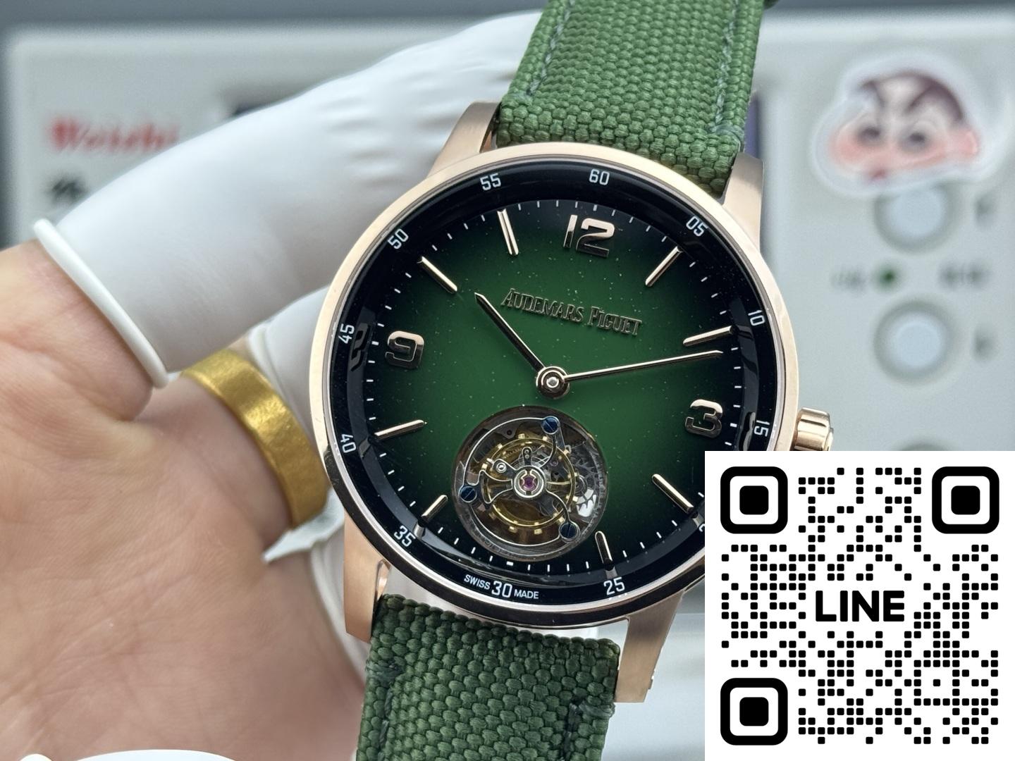 オーデマ・ピゲ 26396NR.OO.D002KB.01は、エレガンスと確かな機能を兼ね備えた、非常に印象的な時計です。まず、機械式ムーブメントを搭載しており、伝統的な時計製造の職人技を高く評価する方にとっては常に嬉しい仕様です。文字盤はスモークグリーンとアベンチュリン素材が際立ち、独特の星空のような外観を演出しています。インデックスと針はピンクゴールド製で、全体のデザインにエレガントな雰囲気を添えています。ストラップはブラックのミックスラバーとテキスタイルのコンビネーションで、快適で耐久性に優れています。