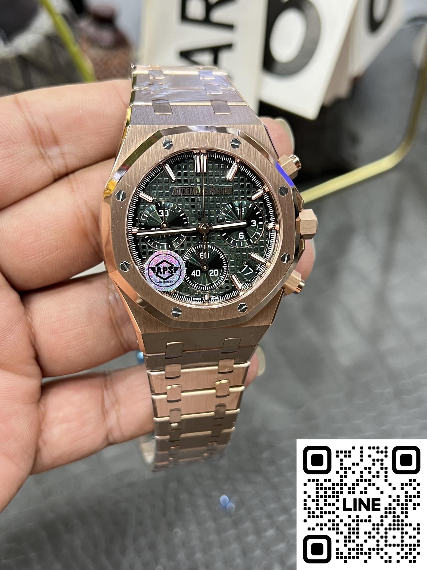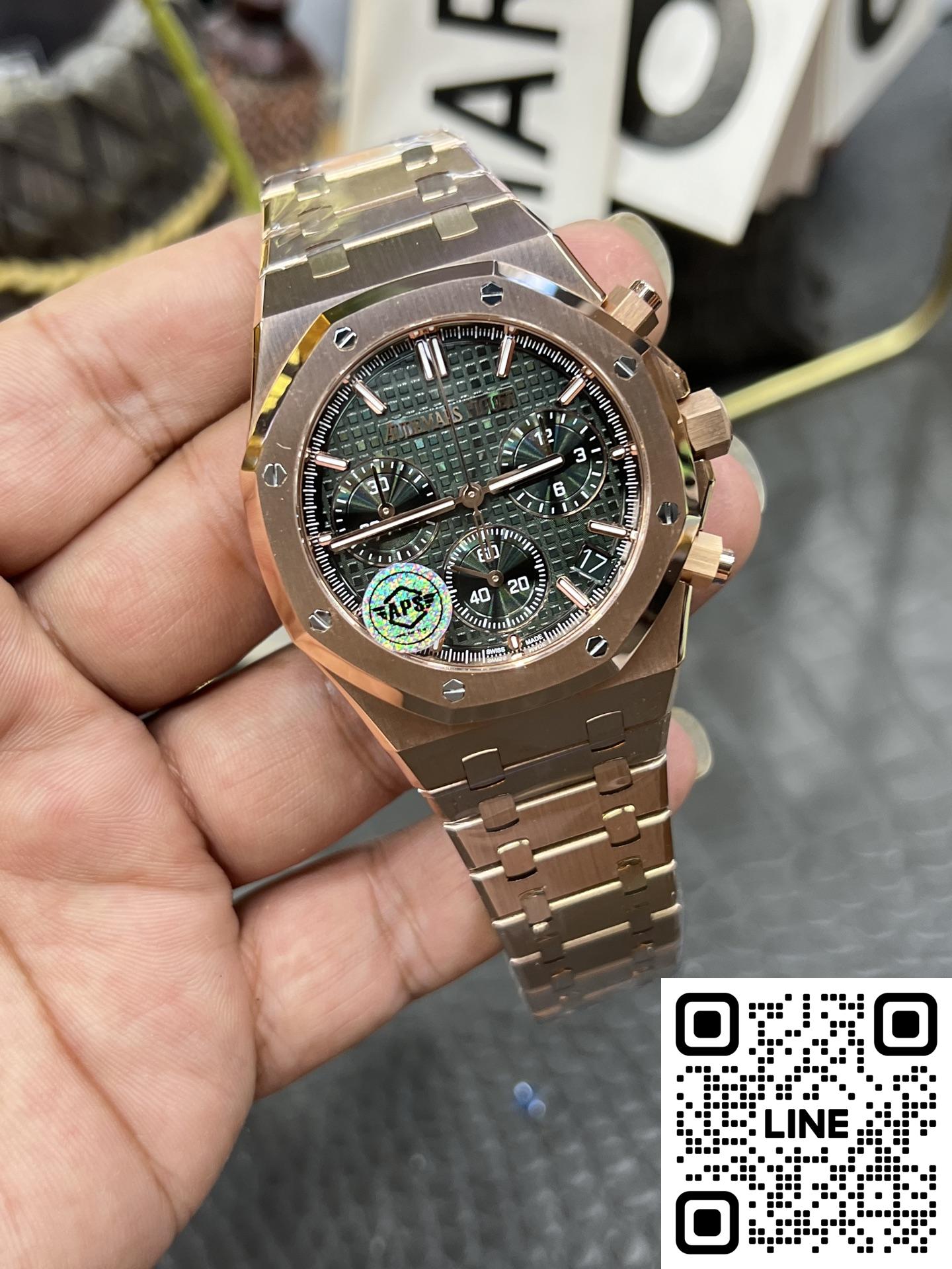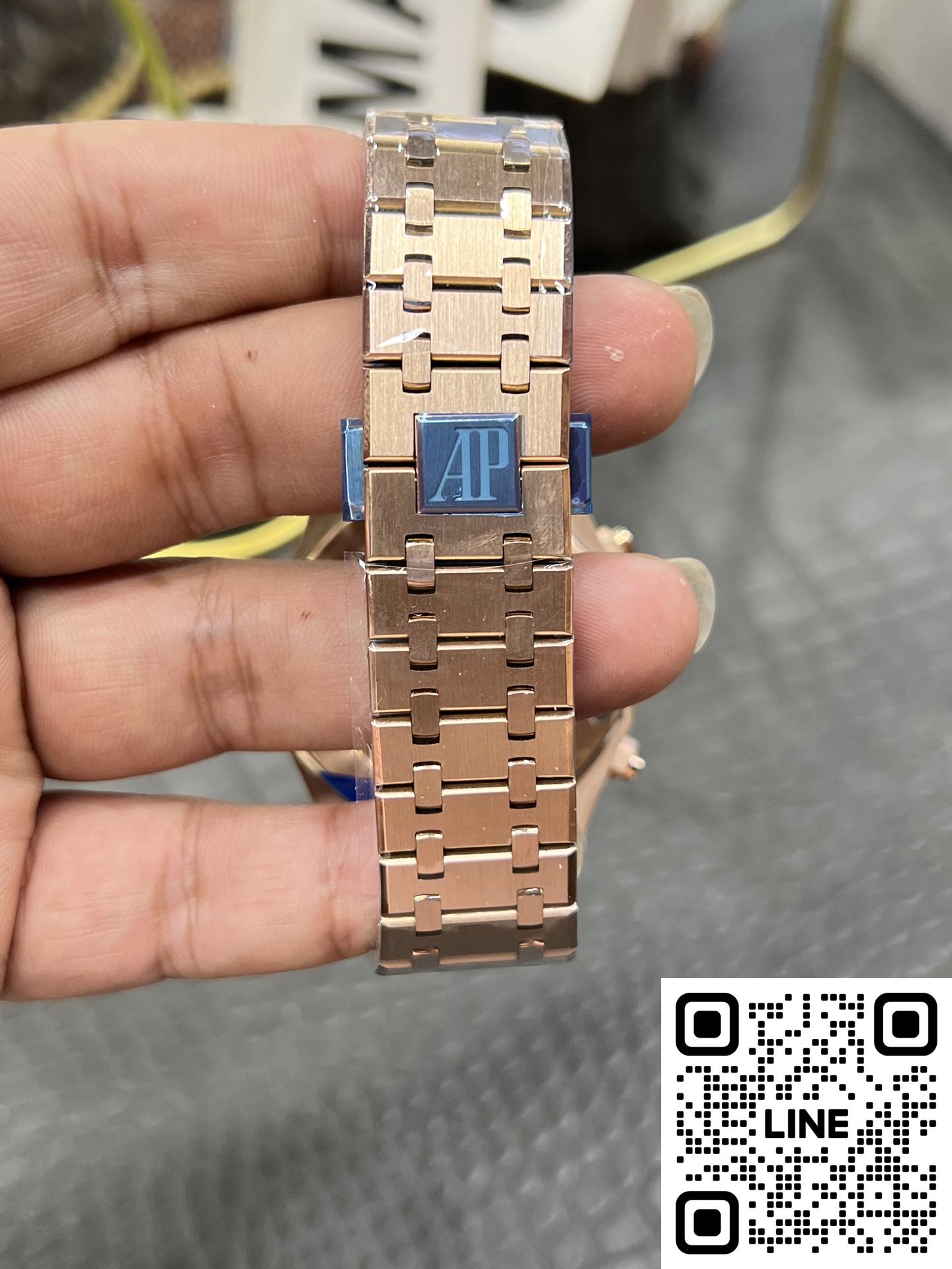 この41ミリのクロノグラフは18Kピンクゴールドケースとカーキの「グランドタペストリー」ダイヤルを組み合わせています。2022年に始まったロイヤル オークの進化したデザインを取り入れています。APS工場はオリジナルのディテールをこれ以上限りなく再現しました。