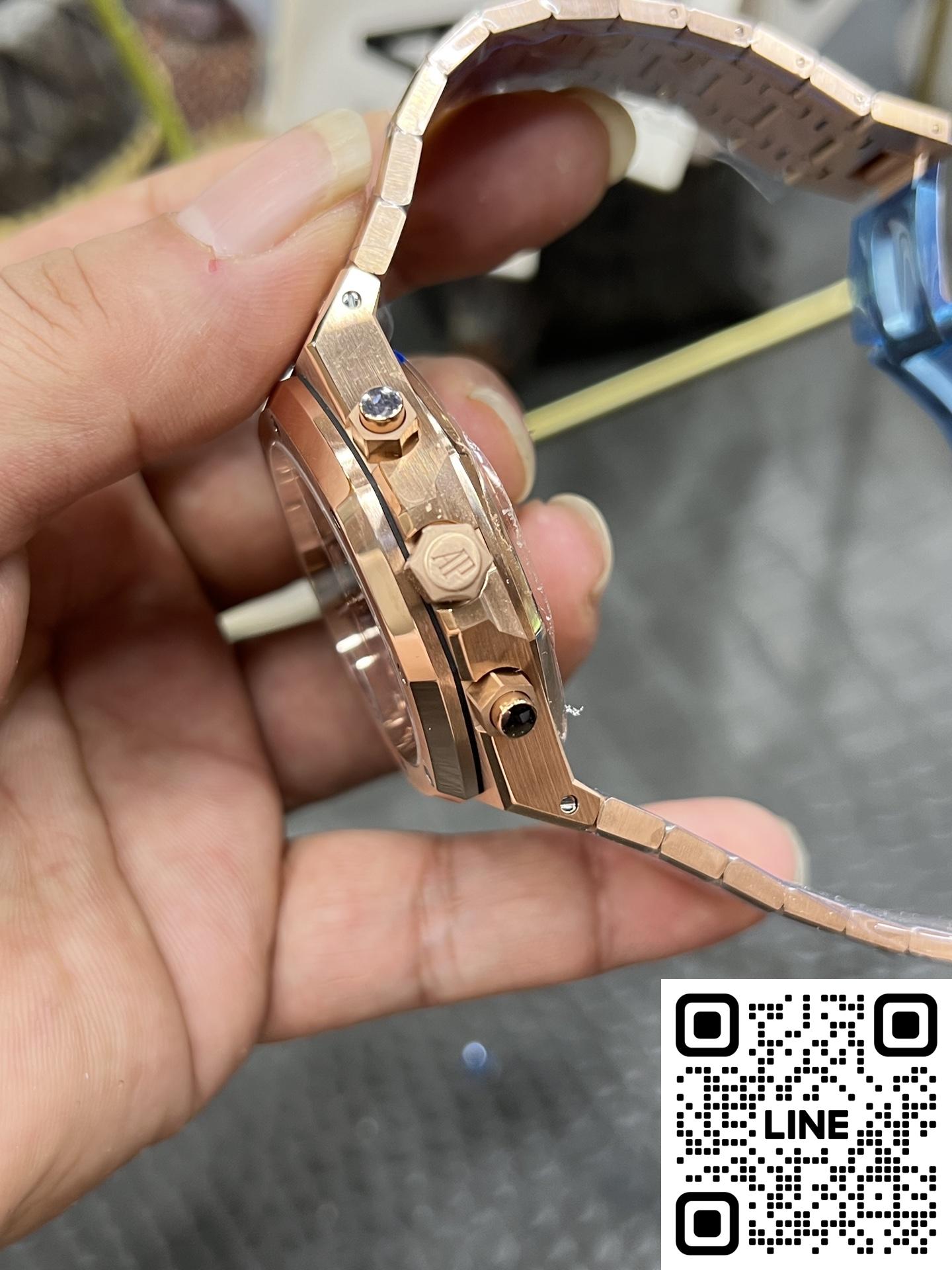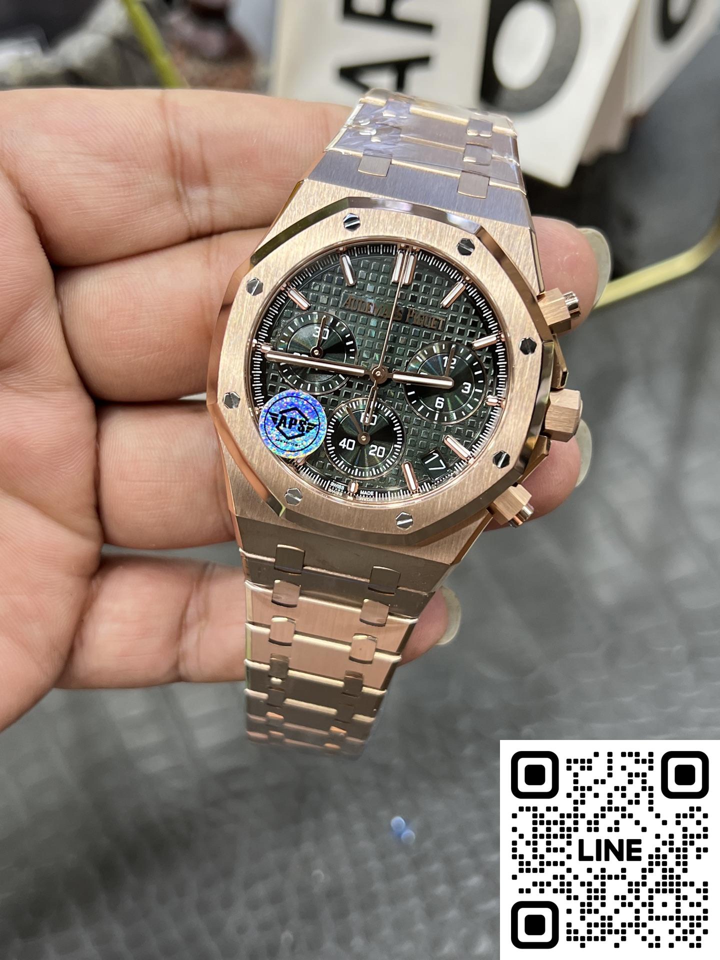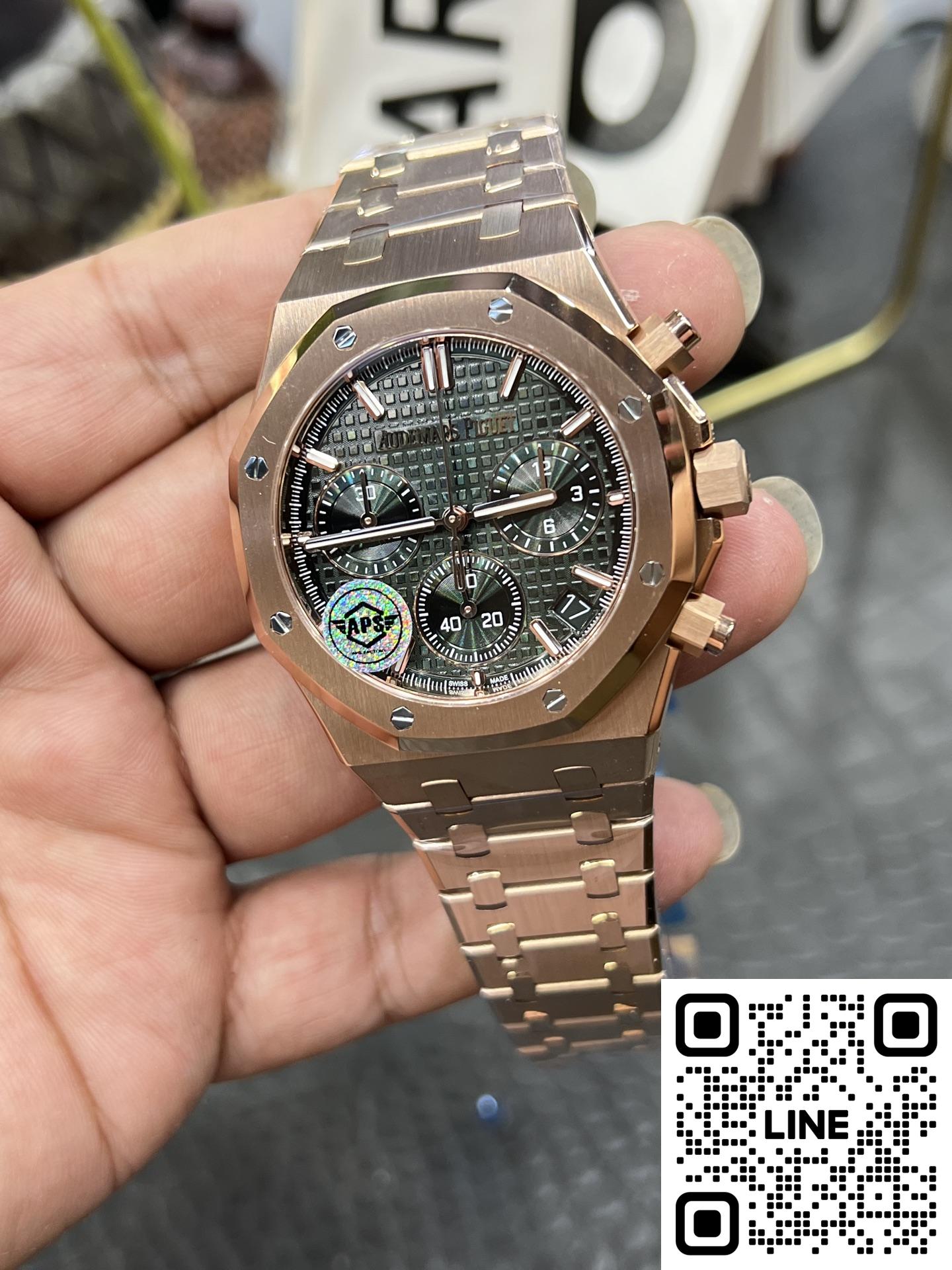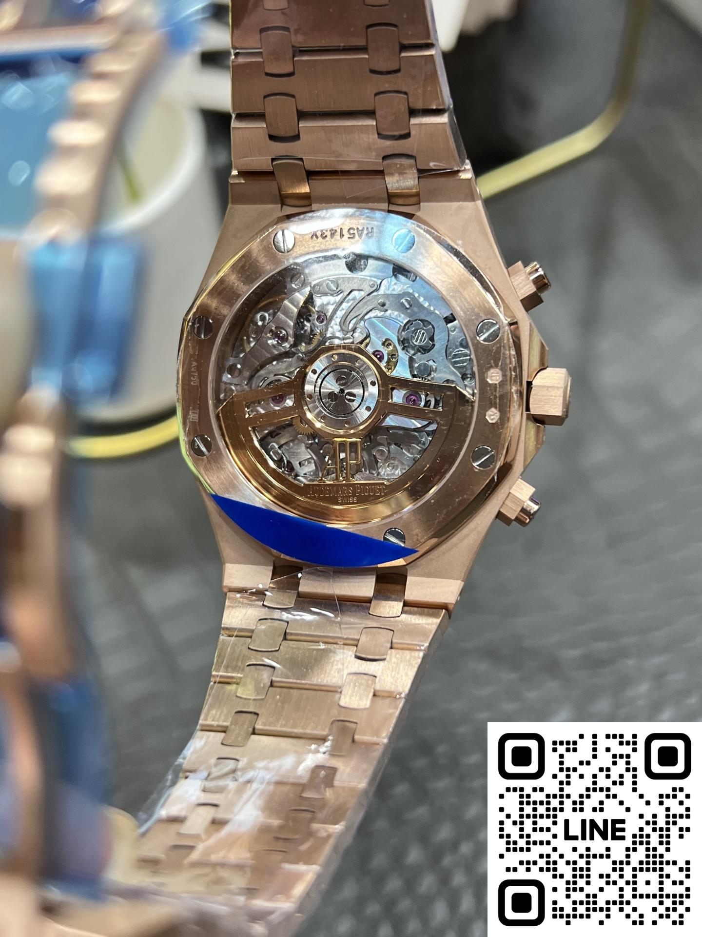 この41ミリのクロノグラフは18Kピンクゴールドケースとカーキの「グランドタペストリー」ダイヤルを組み合わせています。2022年に始まったロイヤル オークの進化したデザインを取り入れています。APS工場はオリジナルのディテールをこれ以上限りなく再現しました。