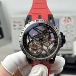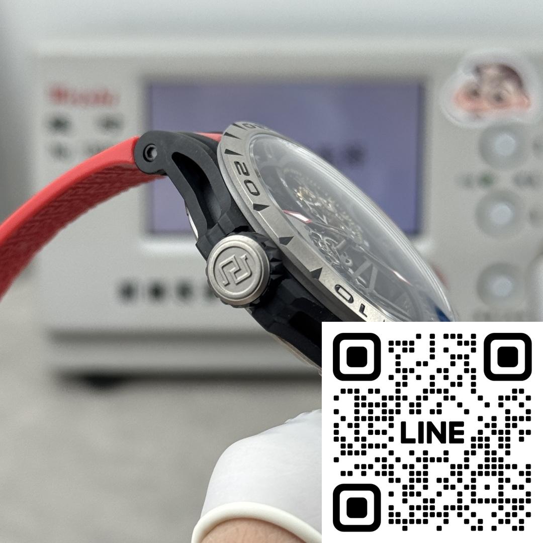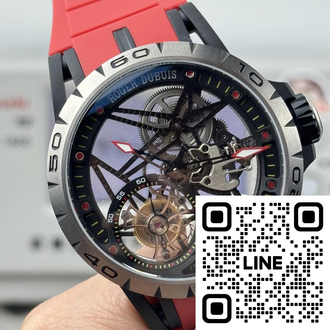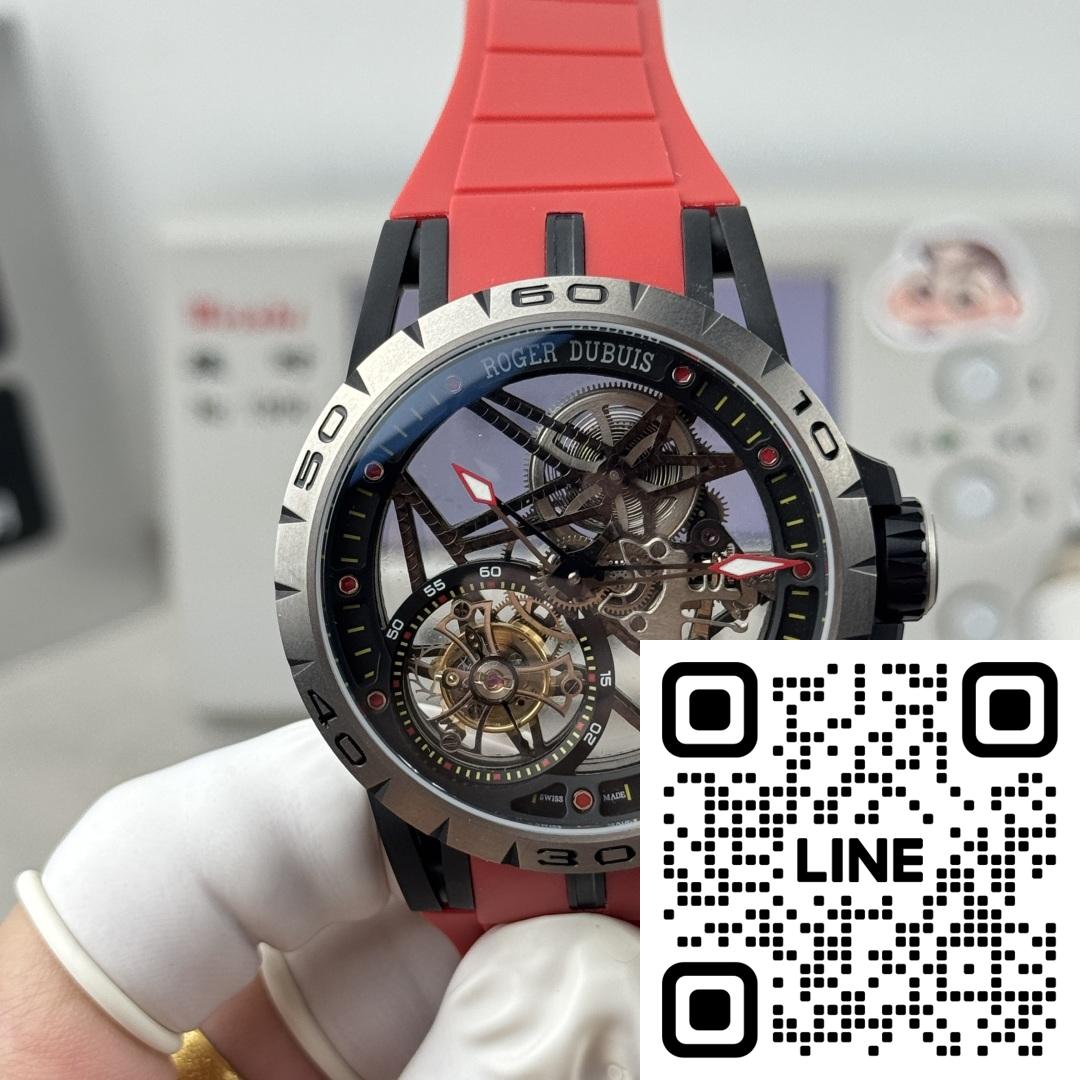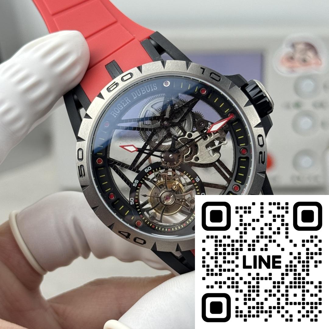 ロジェ・デュブイ エクスカリバー スパイダー(キング・オブ・ウォッチ)RDDBEX0479。これはブランドで最もスーパーカーにインスパイアされたモデルであり、ロジェ・デュブイのスケルトン時計の特徴的な特徴を備えたスケルトンフライングトゥールビヨンウォッチです。45mm x 13mmのチタンケース、星型デザイン、ケルト十字型のトゥールビヨンケージが特徴で、オリジナルを彷彿とさせます。上海特注のRD505SQ手巻きムーブメントを搭載。オリジナルと同様に、ゴールドテンプにはカウンターウェイトが付いています。このムーブメントは、小規模な工場で製造されたムーブメントに比べて安定性と誤差が少なく、オリジナルとの98%の類似性を実現しています。11時と4時の位置に余分な歯車はありません。ムーブメントプレートには整然とした魚の鱗模様の仕上げが施され、不要な日付表示は排除されています。傷に強いサファイアクリスタルと、輸入されたタイ製ラバーを使用しています。