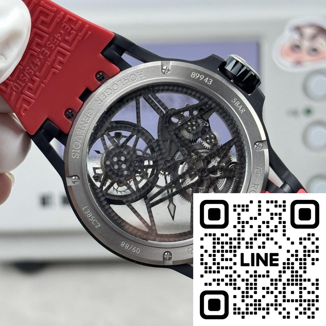 3.文字盤:スケルトン文字盤を採用。夜光インデックス付き。ブラックDLCコーティングチタン製秒針盤にはブラック分目盛とRoger Dubuis(ロジェ・デュブイ)の刻印。針には夜光塗料を施し、視認性に優れる。