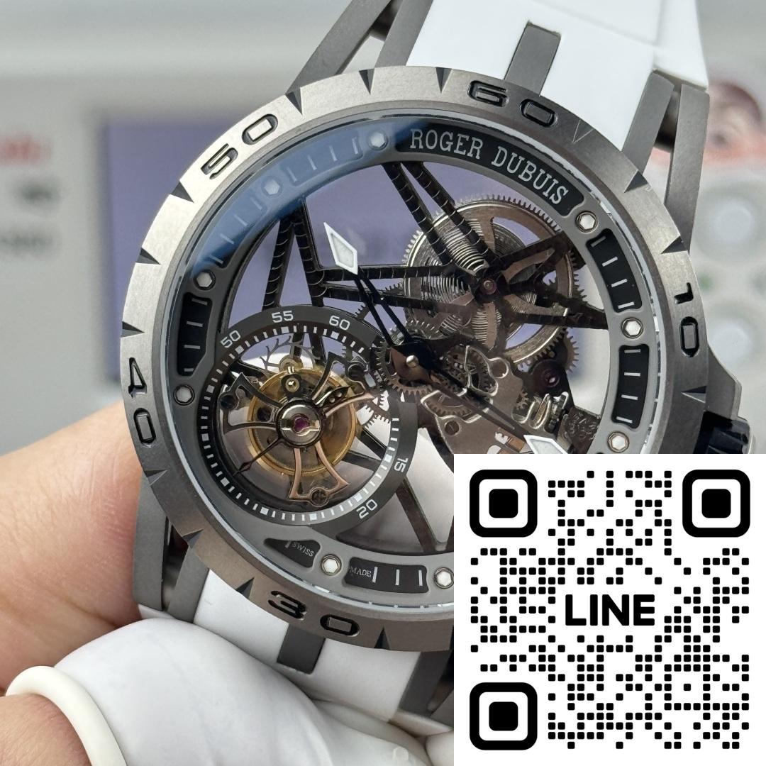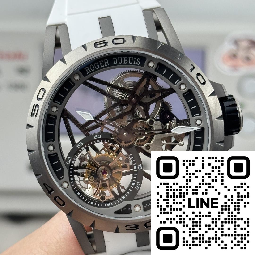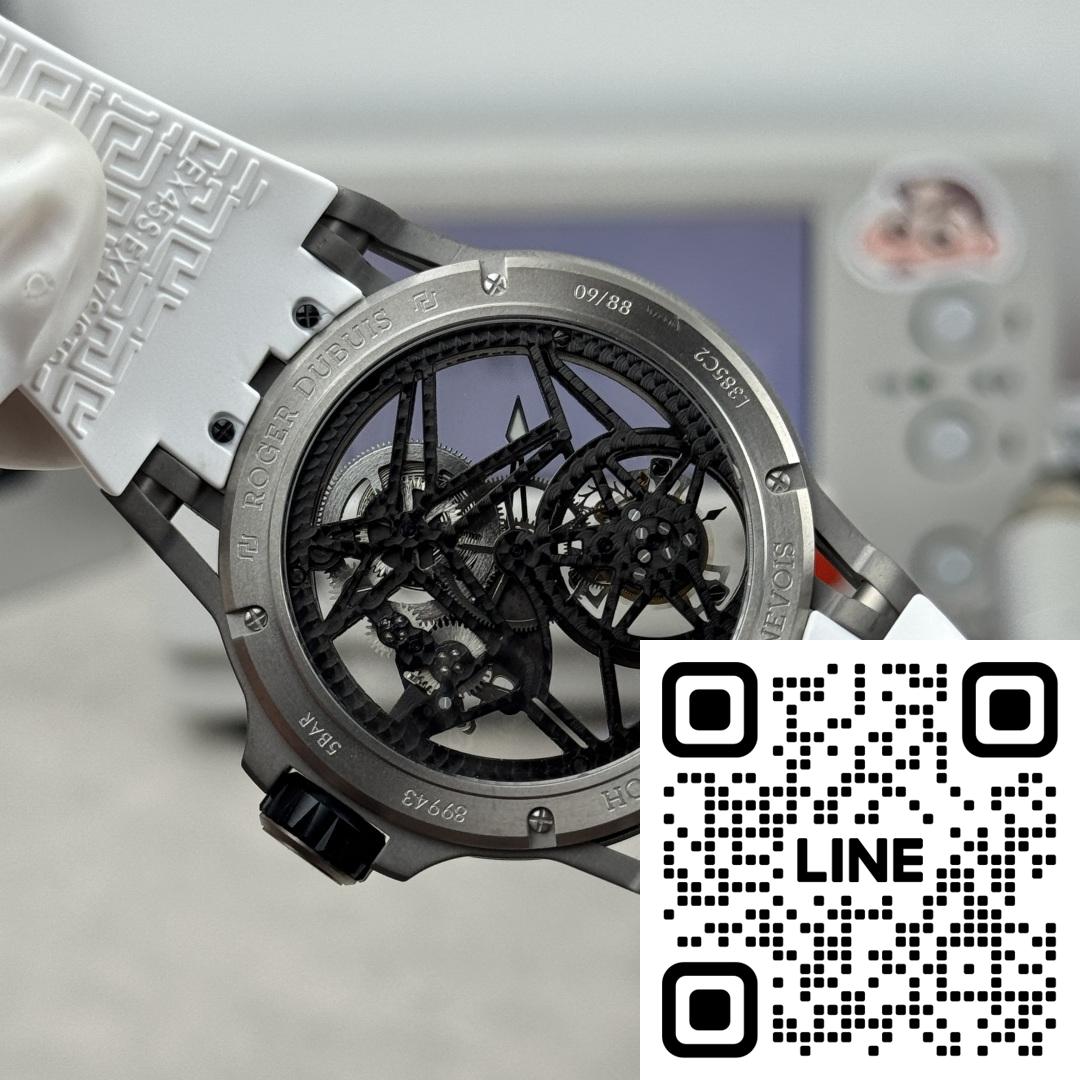 3.文字盤:スケルトン文字盤を採用。夜光インデックス付き。ブラックDLCコーティングチタン製秒針盤にはブラック分目盛とRoger Dubuis(ロジェ・デュブイ)の刻印。針には夜光塗料を施し、視認性に優れる。