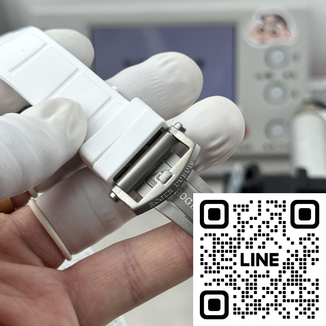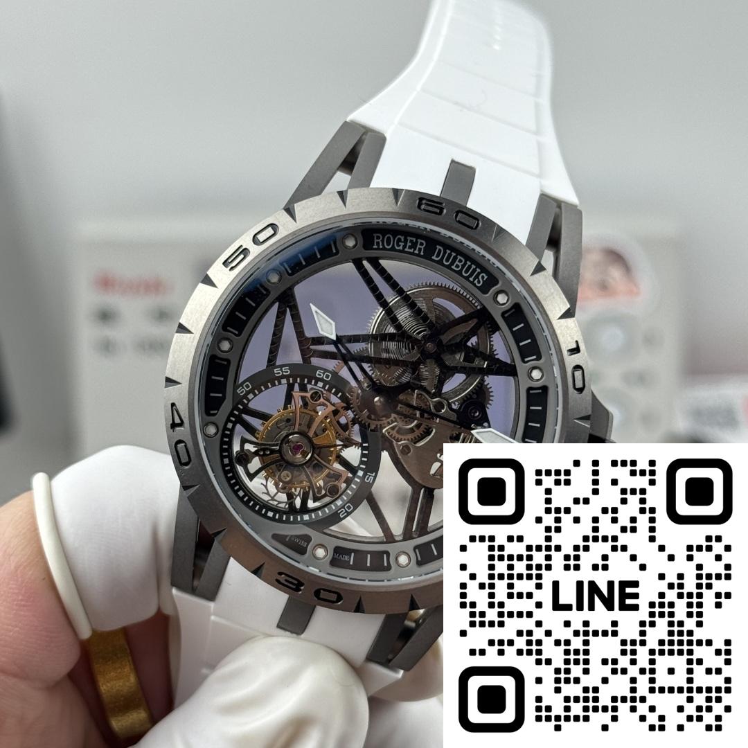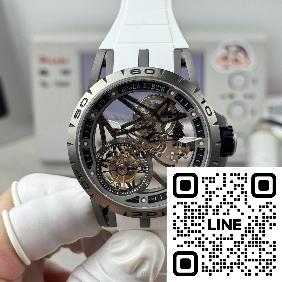 3.文字盤:スケルトン文字盤を採用。夜光インデックス付き。ブラックDLCコーティングチタン製秒針盤にはブラック分目盛とRoger Dubuis(ロジェ・デュブイ)の刻印。針には夜光塗料を施し、視認性に優れる。