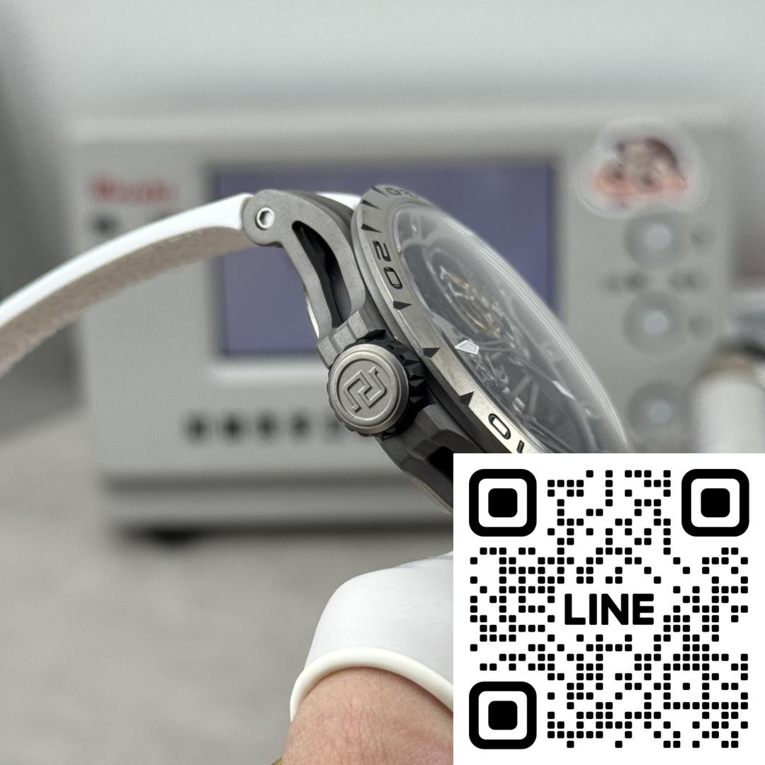 これはブランドで最も象徴的なスーパーカーにインスパイアされたモデルであり、JB Dubiのスケルトン時計の特徴的な特徴を備えたスケルトンフライングトゥールビヨンウォッチです。45mm x 13mmのチタン合金ケース、星型の外装デザイン、ケルト十字型のトゥールビヨンケージが特徴です。カスタムメイドのRD505SQ手巻きムーブメントを搭載し、ゴールドテンプのウェイトを再調整することで、オリジナルに比べて安定性と精度が向上しています。ムーブメント本体はオリジナルと98%類似しており、11時と4時の位置に余分な歯はありません。ムーブメントプレートには整然とした魚の鱗模様が施され、不要な日付位置は排除されています。傷に強いサファイアクリスタル、柔軟性が高く精巧に作られたタイ製の輸入ラバーストラップ、オリジナルのフォールディングクラスプを備えています。パワフルでスタイリッシュ、そして高級感を漂わせるこの時計は、スポーツカー愛好家にとってマストハブとなる、抜群の視認性を備えています。