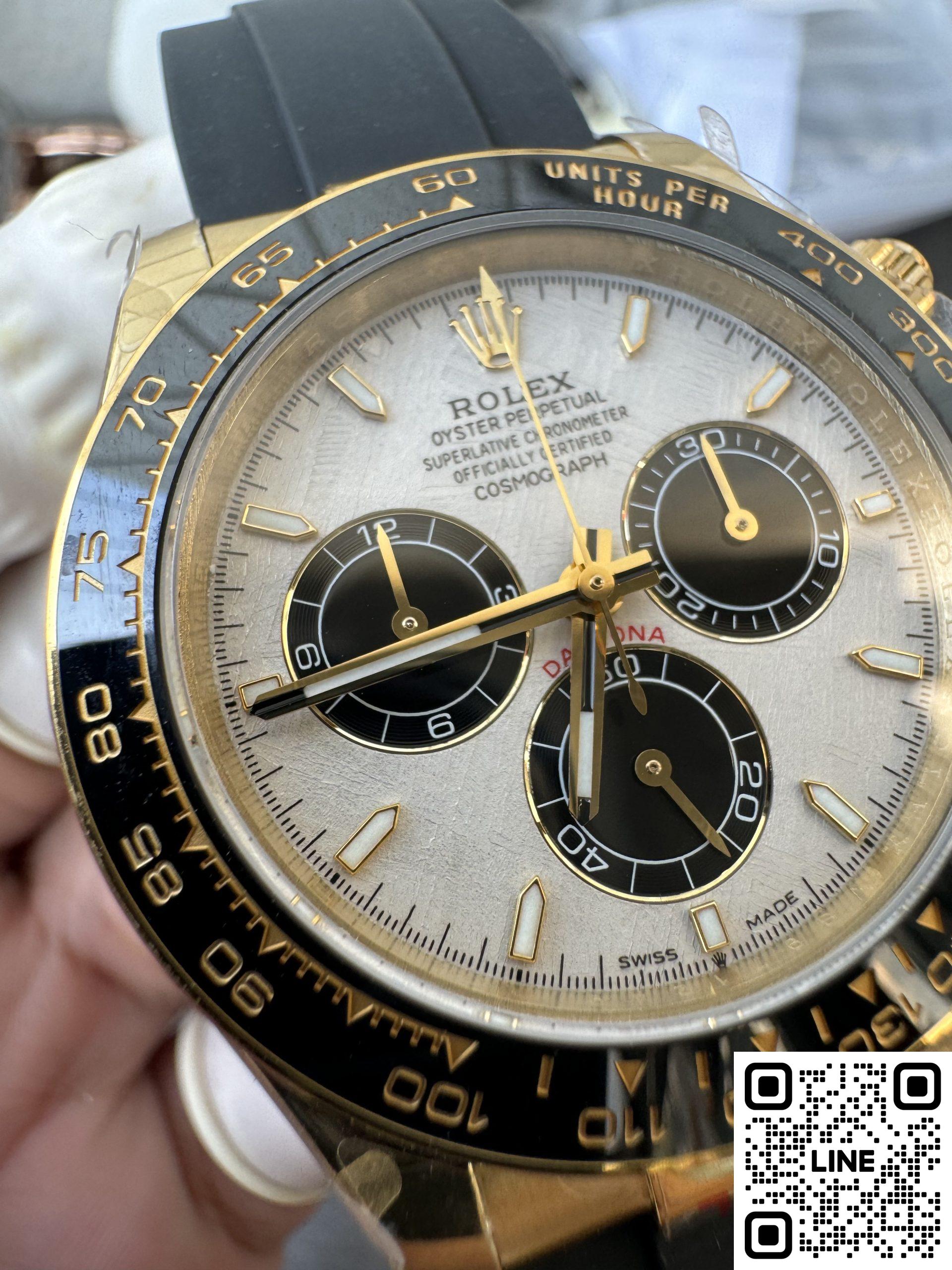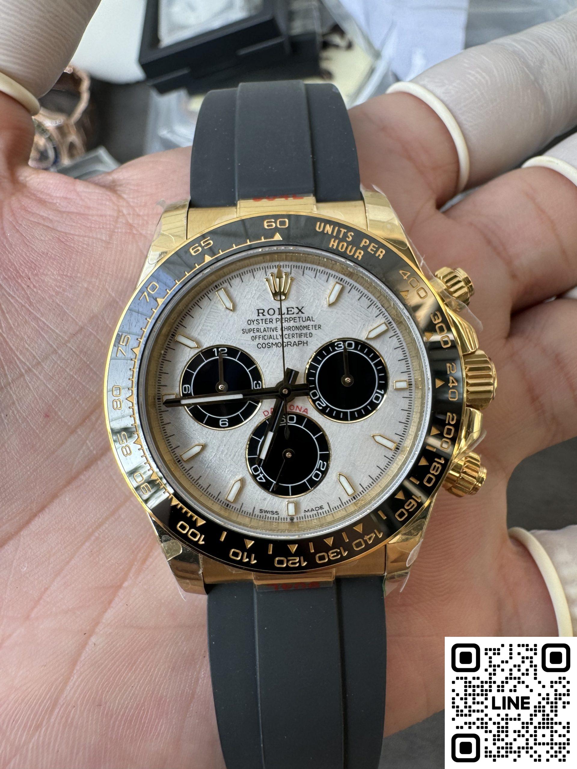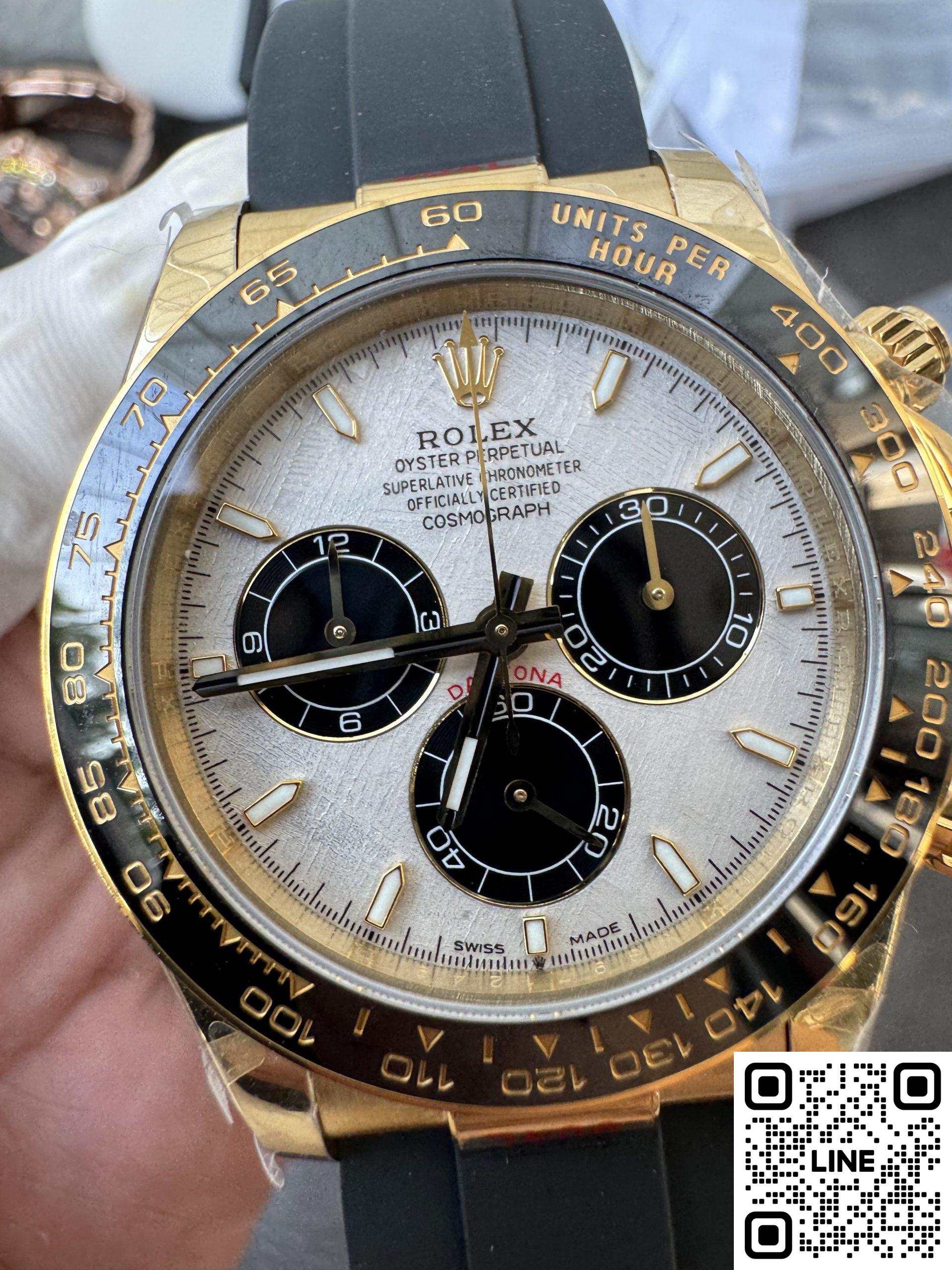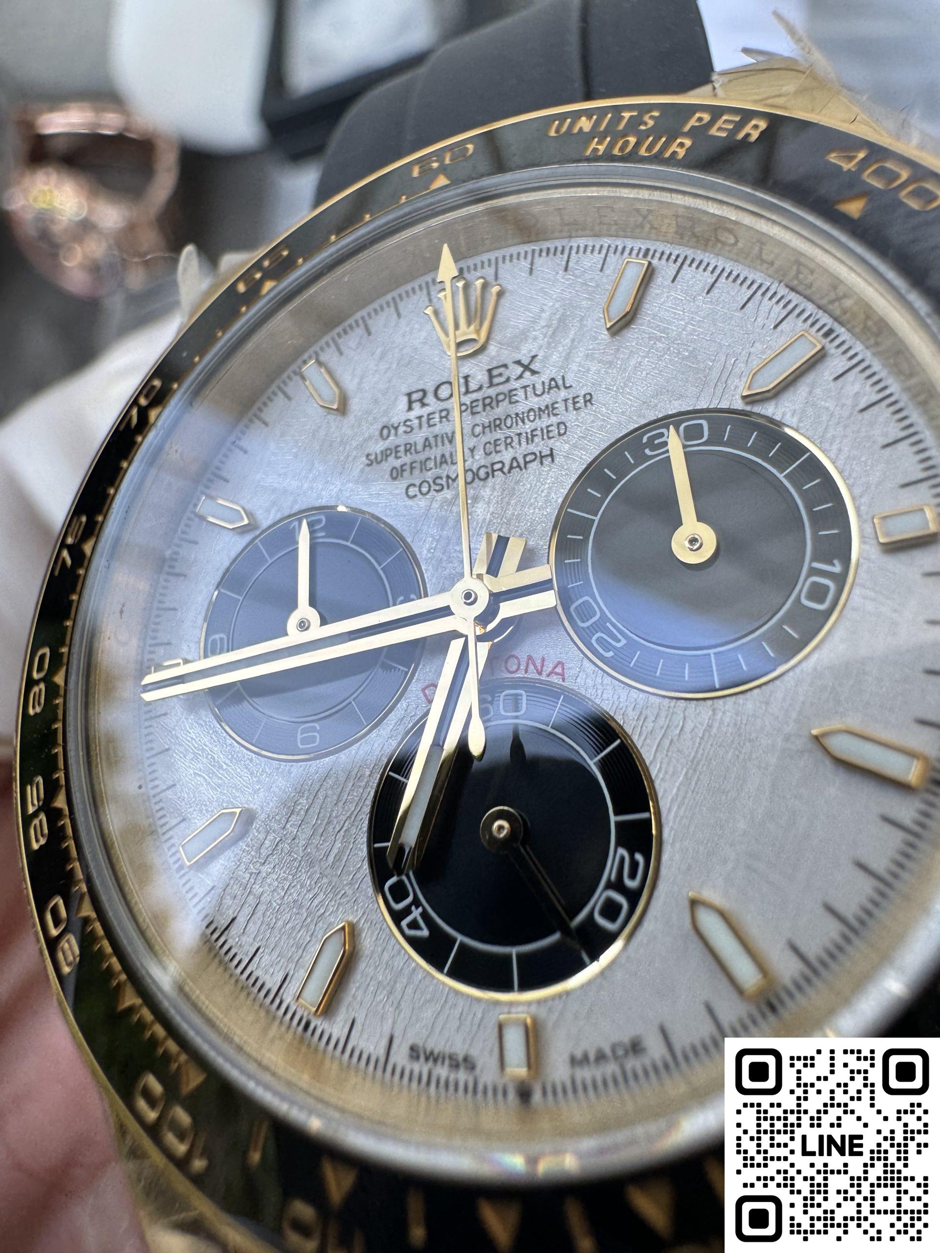 2025年に3種類のゴールド合金と隕石文字盤を備えた3種類の新しいデイトナが発表されました。イエローゴールドのRef.126518LN-0016は、貴金属のロレックスとラバーストラップの組み合わせです。ベルトは安定性をもたらす2枚のメタルブレードが中心にあります。これらのブレードは、他の素材よりも温度変化、水、ひび割れに強いラバーで覆われています。内側には快適なクッションが備えられています。留め具はロレックス・グライドロック・エクステンションシステムを備えたオイスターロッククラスプで、工具を使わずに1ノッチずつ最大20mmの調整が可能です。