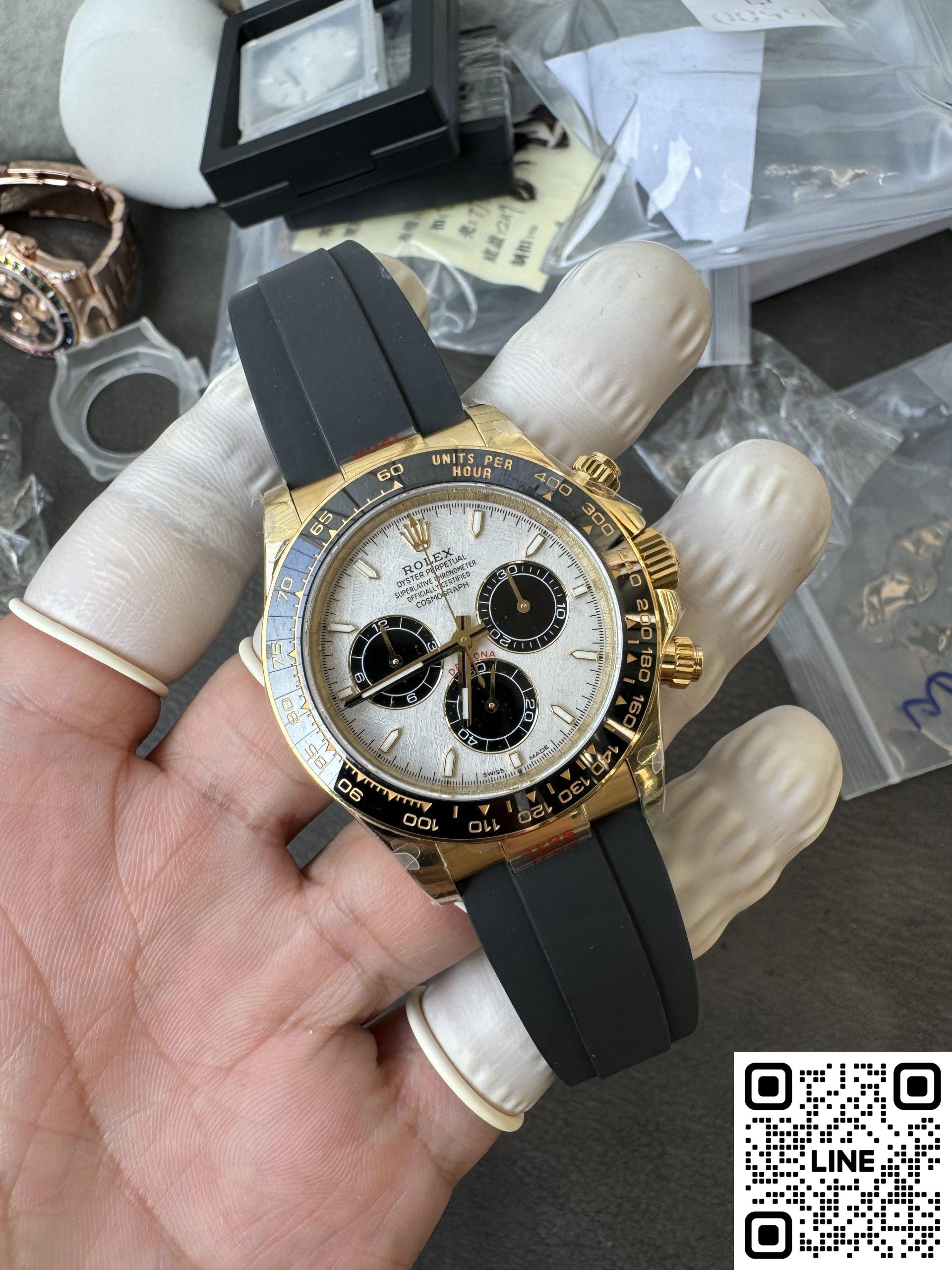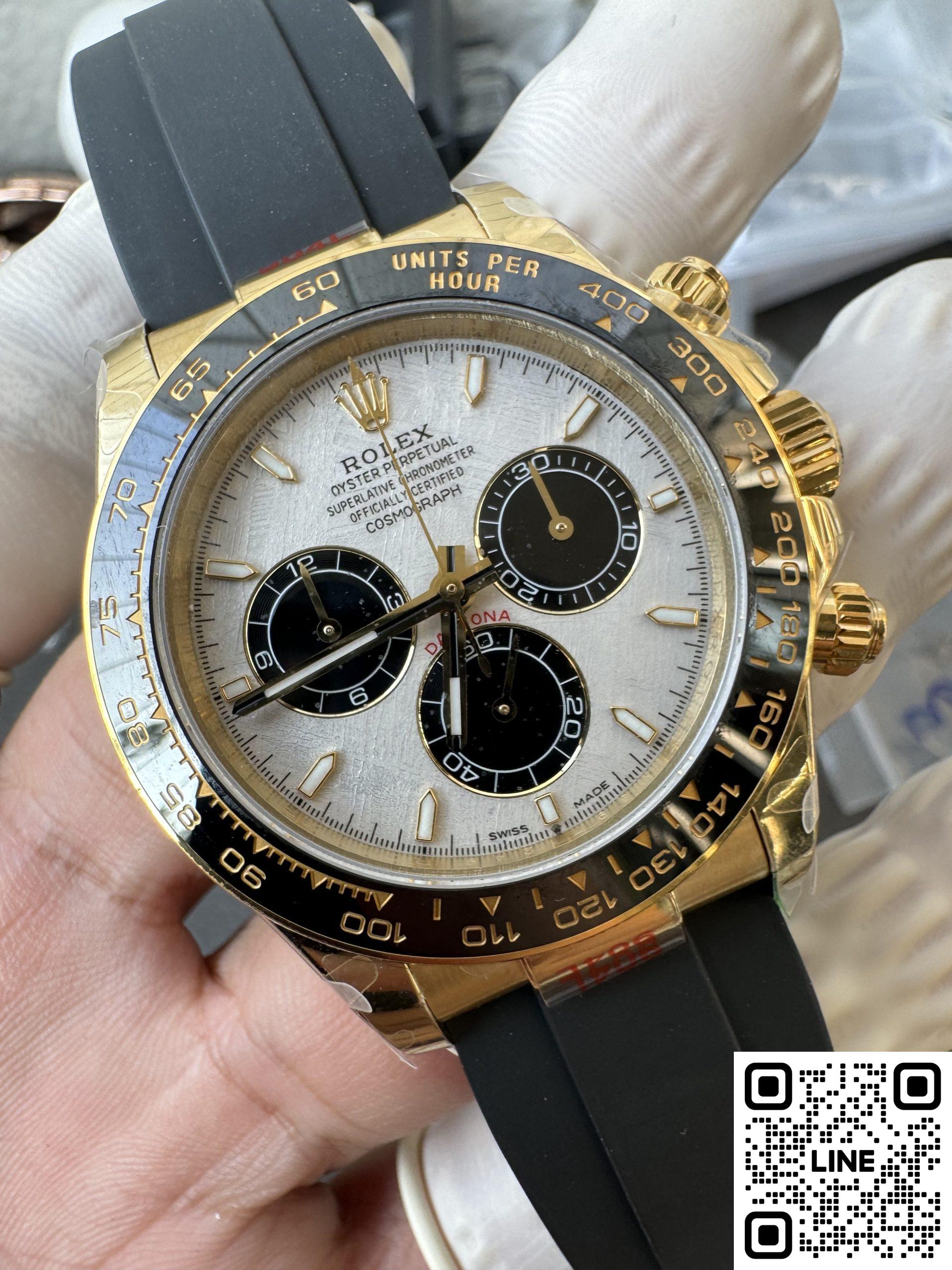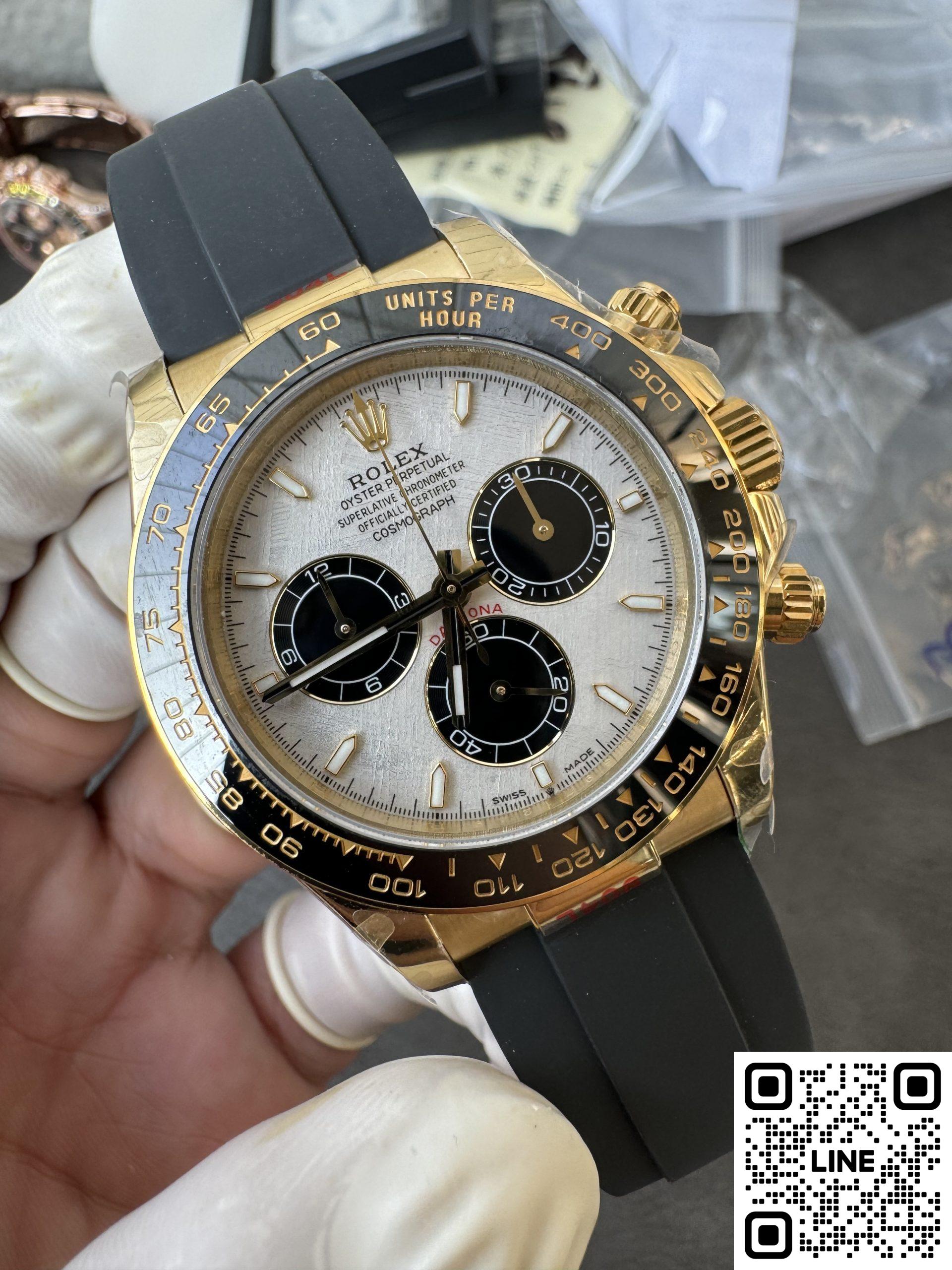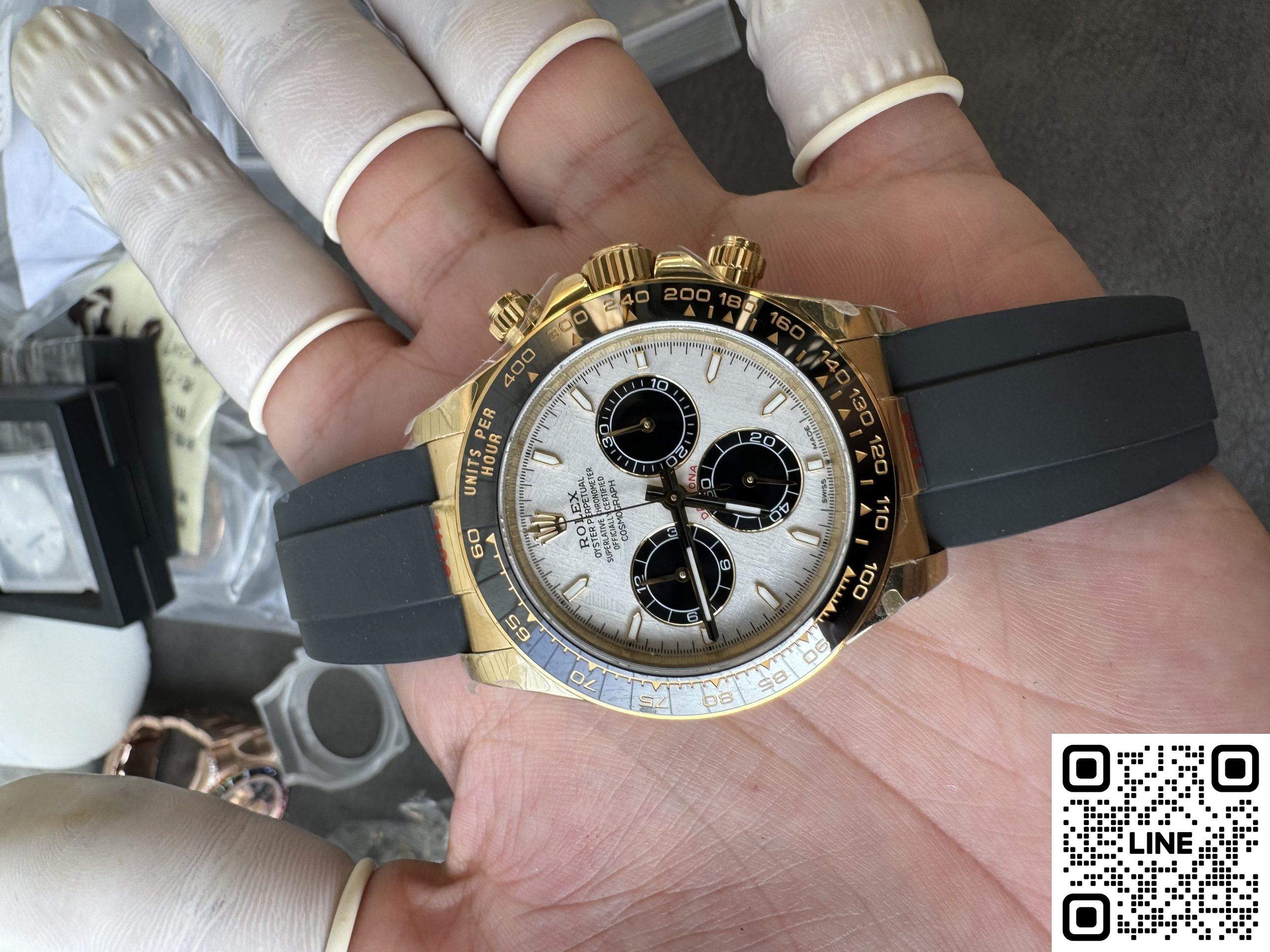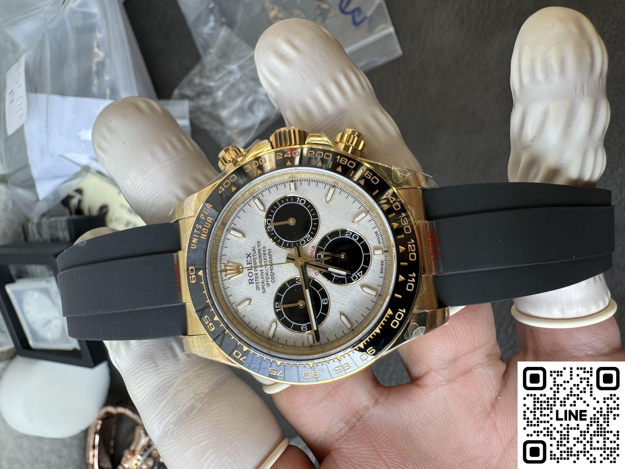 2025年に3種類のゴールド合金と隕石文字盤を備えた3種類の新しいデイトナが発表されました。イエローゴールドのRef.126518LN-0016は、貴金属のロレックスとラバーストラップの組み合わせです。ベルトは安定性をもたらす2枚のメタルブレードが中心にあります。これらのブレードは、他の素材よりも温度変化、水、ひび割れに強いラバーで覆われています。内側には快適なクッションが備えられています。留め具はロレックス・グライドロック・エクステンションシステムを備えたオイスターロッククラスプで、工具を使わずに1ノッチずつ最大20mmの調整が可能です。