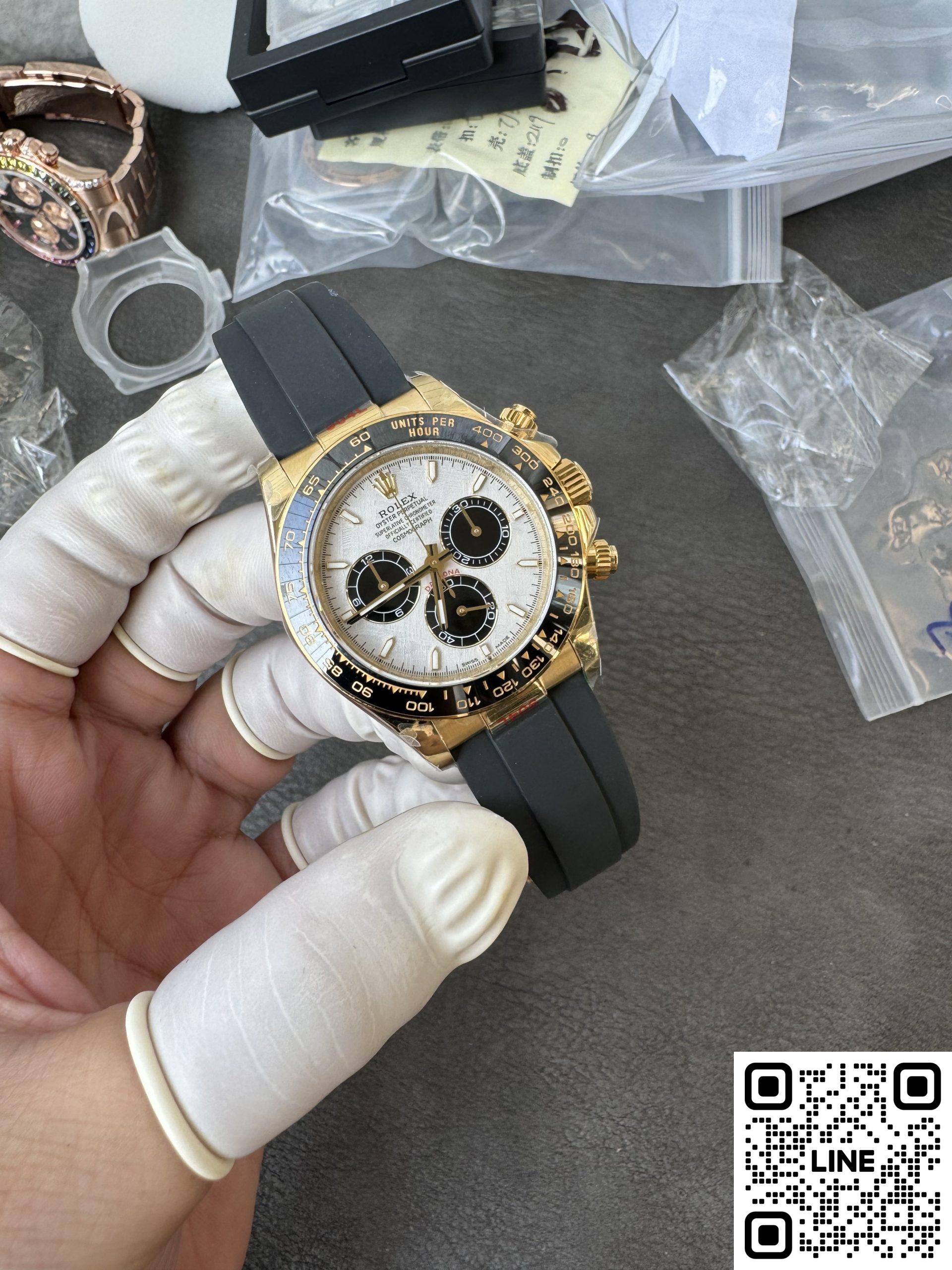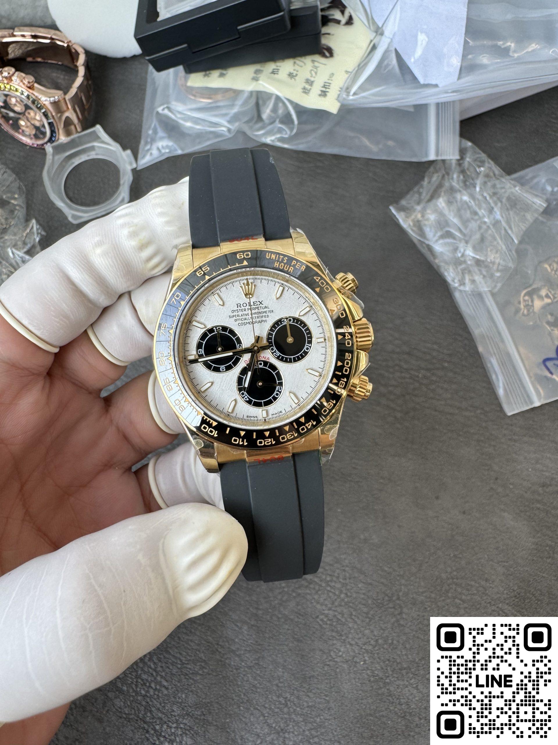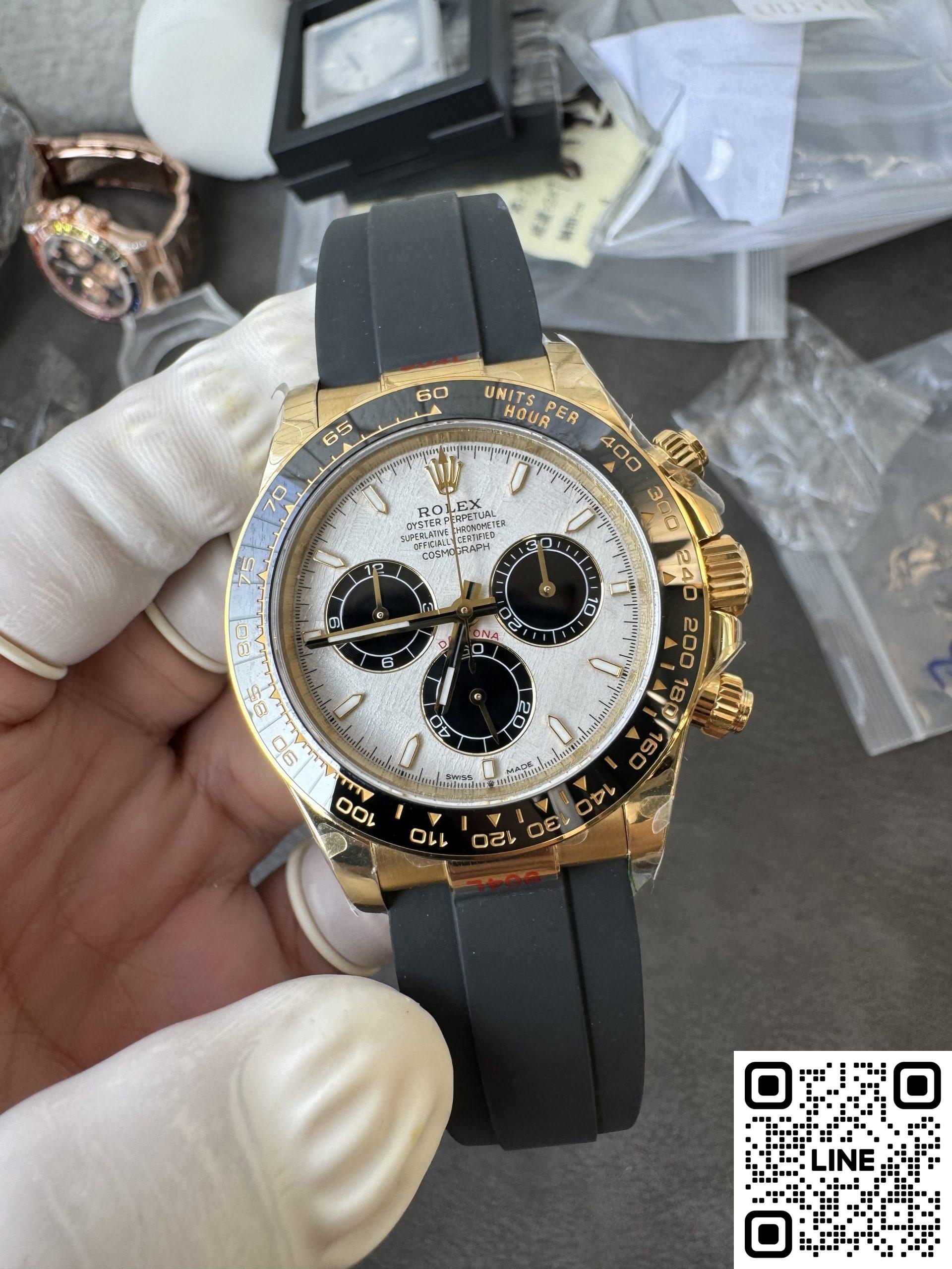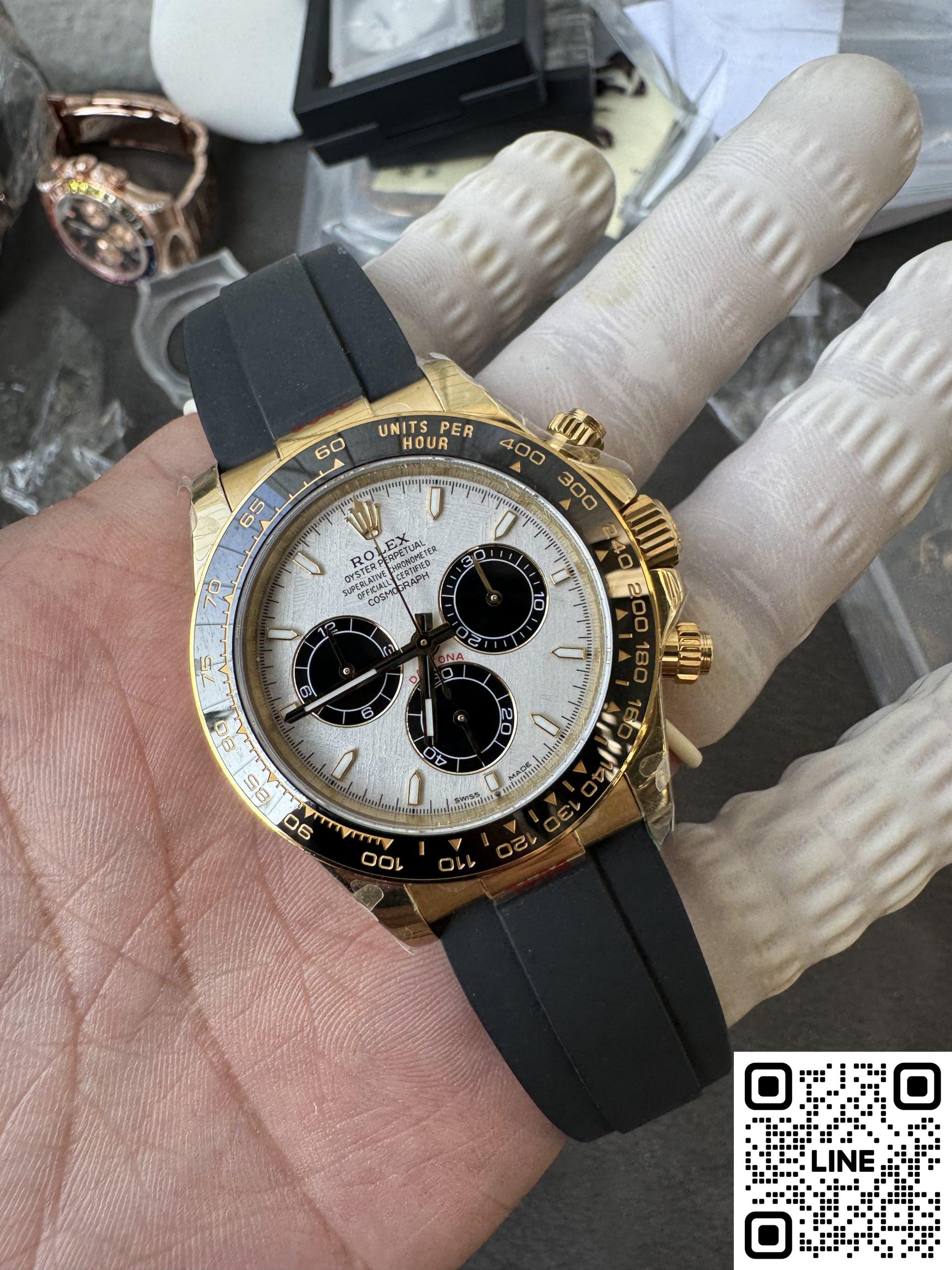 2025年に3種類のゴールド合金と隕石文字盤を備えた3種類の新しいデイトナが発表されました。イエローゴールドのRef.126518LN-0016は、貴金属のロレックスとラバーストラップの組み合わせです。ベルトは安定性をもたらす2枚のメタルブレードが中心にあります。これらのブレードは、他の素材よりも温度変化、水、ひび割れに強いラバーで覆われています。内側には快適なクッションが備えられています。留め具はロレックス・グライドロック・エクステンションシステムを備えたオイスターロッククラスプで、工具を使わずに1ノッチずつ最大20mmの調整が可能です。