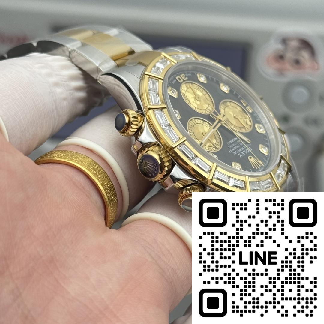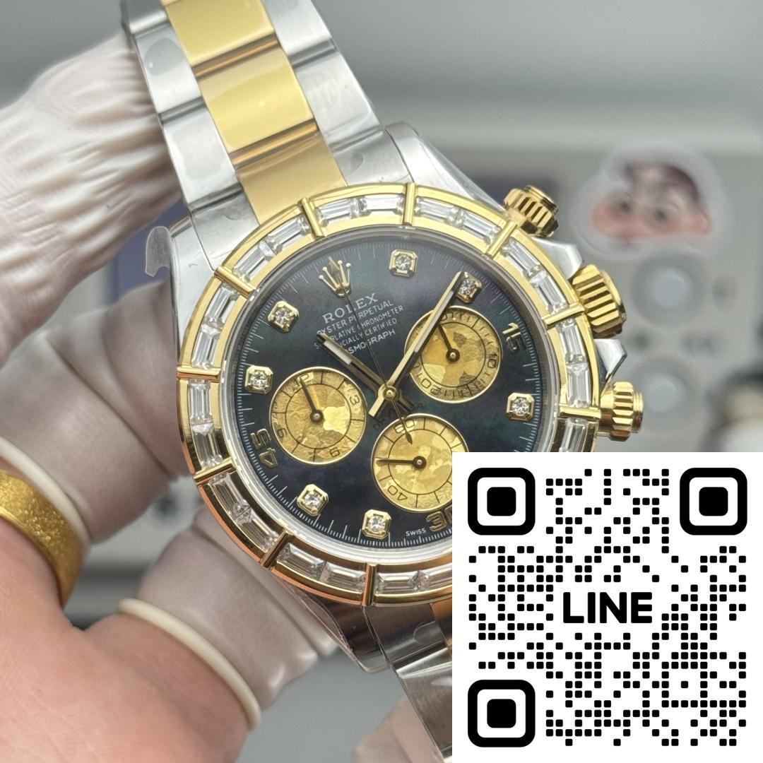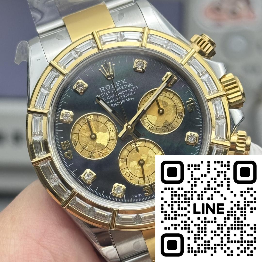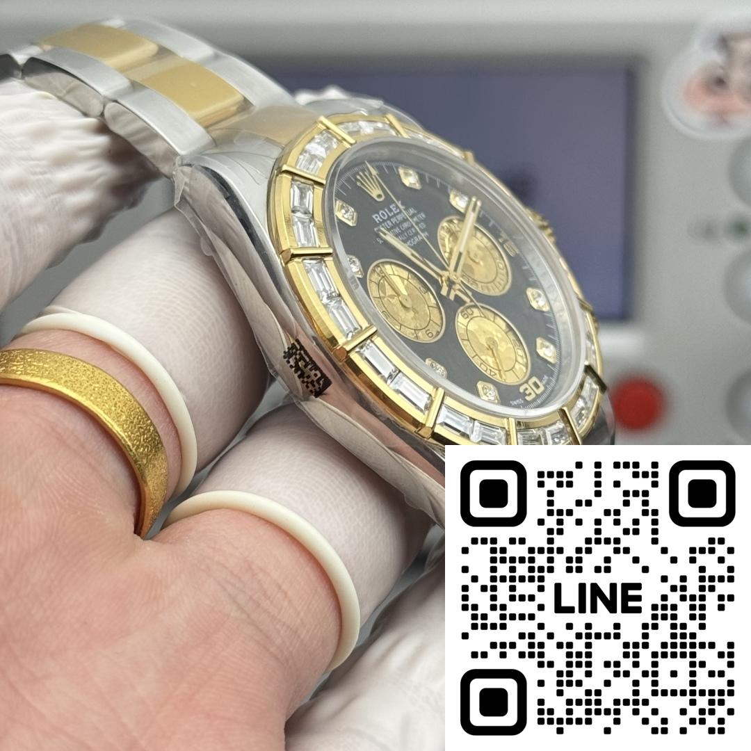 この時計はブラックマザオブパールダイヤモンド入り文字盤を備え、サブダイヤルはマザオブパールゴールドで、コンビゴールドのベルトとリューズなど相まって、時計の高級感を引き出します。竹節式のダイヤモンド入ベゼルもこの時計の不可欠な特徴です。ダイヤモンドリはモアサナイトで、本物のダイヤモンドに劣らない輝きを光ります。通常の文字盤に不満足し、よりユニックなデイトナを手に入れたい愛好家にとって、このレアアイテムはまるで最高の選択肢です。