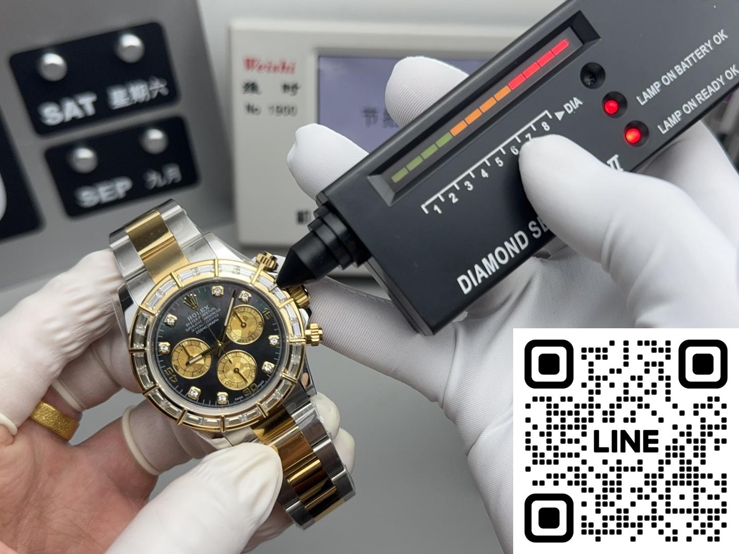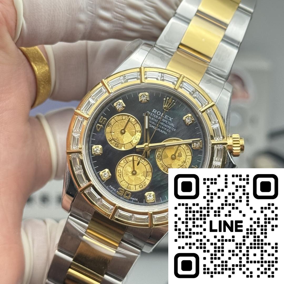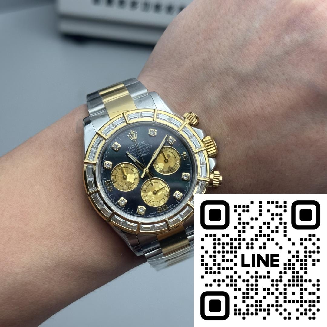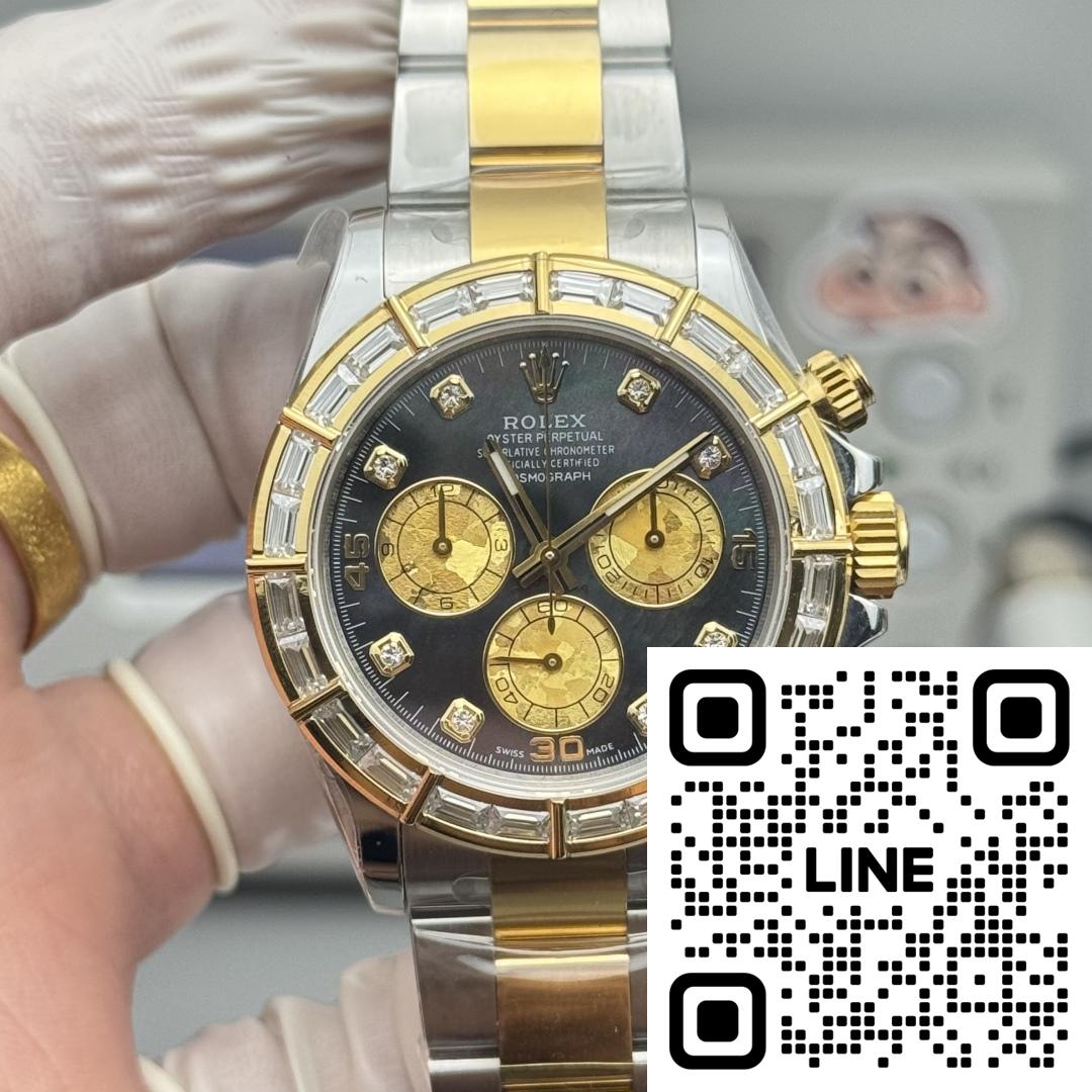 この時計はブラックマザオブパールダイヤモンド入り文字盤を備え、サブダイヤルはマザオブパールゴールドで、コンビゴールドのベルトとリューズなど相まって、時計の高級感を引き出します。竹節式のダイヤモンド入ベゼルもこの時計の不可欠な特徴です。ダイヤモンドリはモアサナイトで、本物のダイヤモンドに劣らない輝きを光ります。通常の文字盤に不満足し、よりユニックなデイトナを手に入れたい愛好家にとって、このレアアイテムはまるで最高の選択肢です。