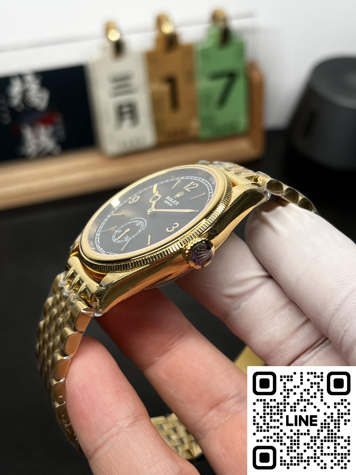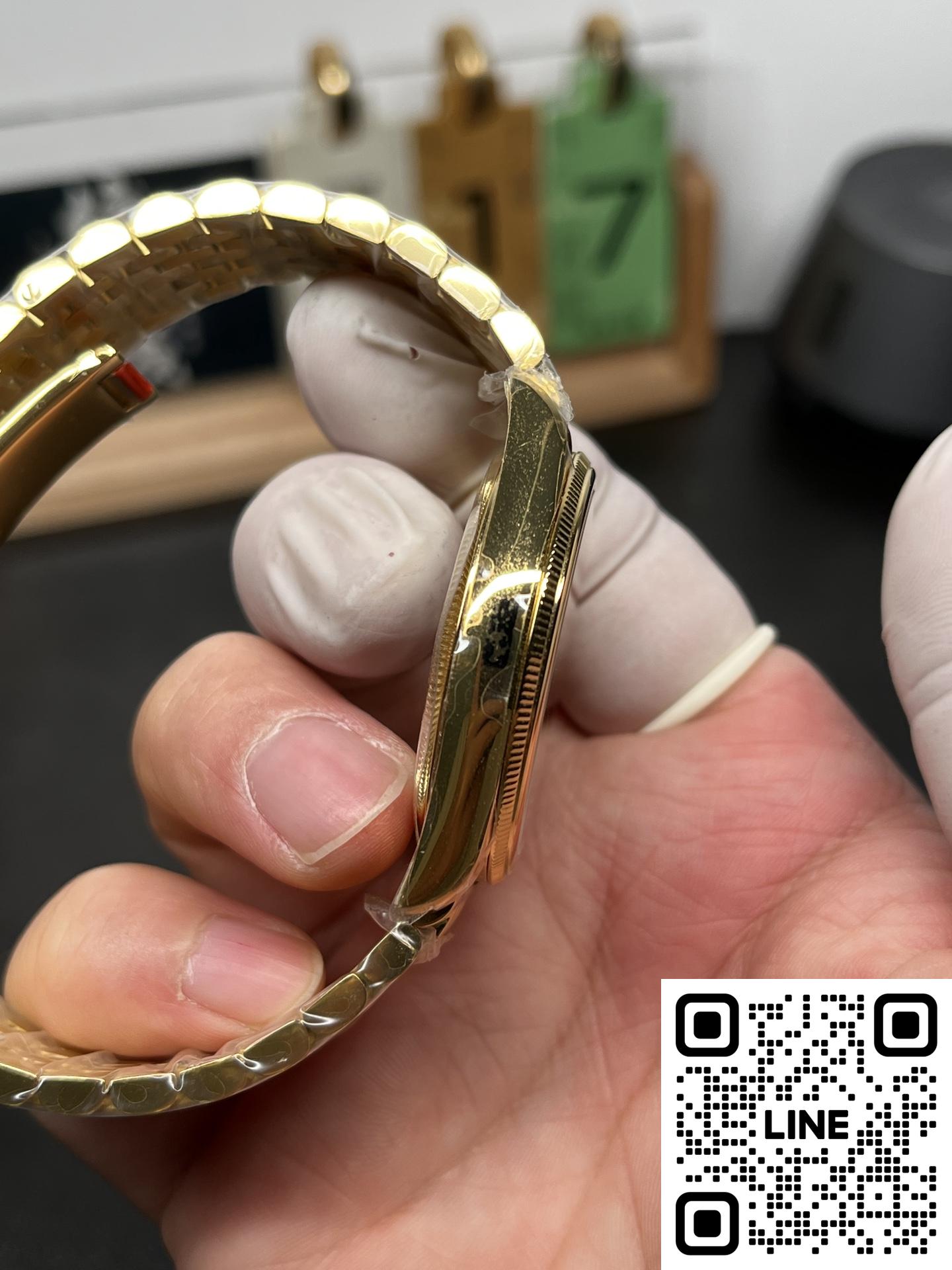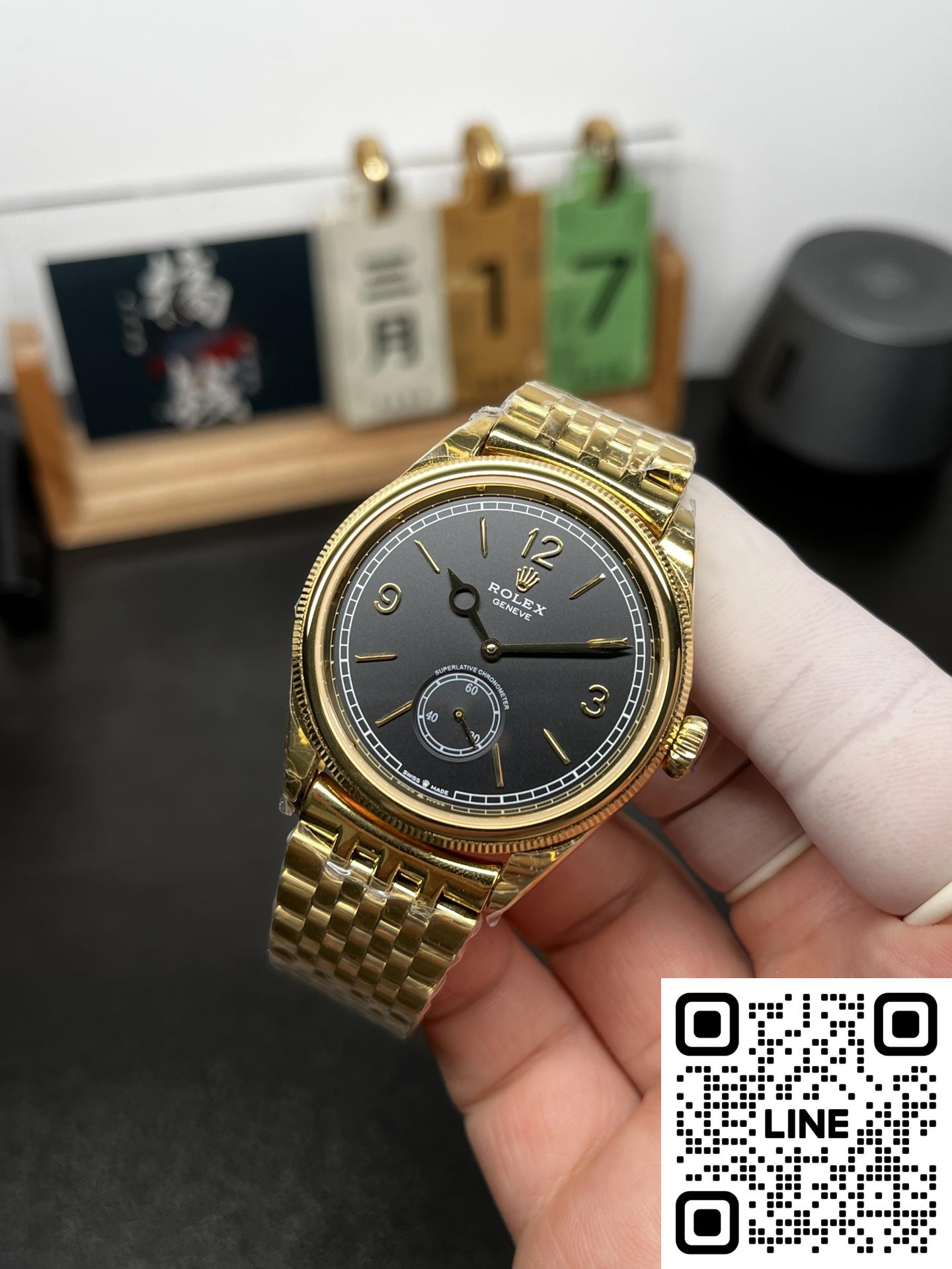 ちらの時計は、R+Factoryの新作、超薄型90gの配重版二針半ビジネスモデルです。モデル名は、ロレックスの恒動1908型で、サイズは39mm✖️9.8mmと非常にエレガントで洗練されたデザインとなっています。本モデルには、独自にカスタマイズされたChronergy擒縱システムが搭載され、さらにブルーSyloxiヒゲゼンマイを採用したCal.7140自動巻きムーブメントを採用しています。これにより、非常に高い精度と耐久性を実現しています。また、K金のスチール印象を再現した折りたたみ式のバックルが装備され、手元にぴったりとフィットします。さらに、K金の質感と手に持った時の重さをよりリアルに感じることができるため、プレミアムな時計の本物の感触をお楽しみいただけます。ビジネスシーンやカジュアルな装いにも合わせやすい洗練されたデザインのこの時計は、持つ人に確かな品格を与える一品です。
