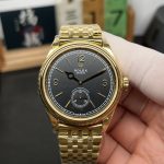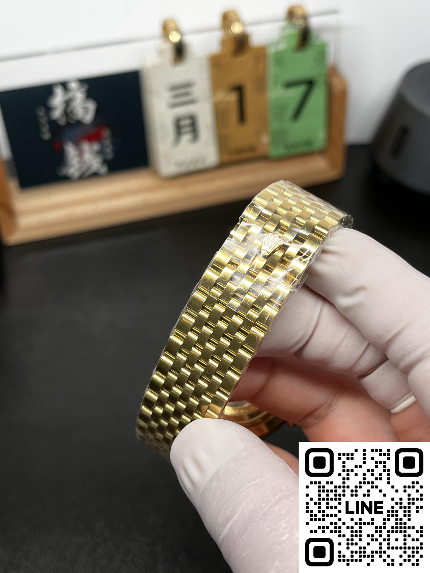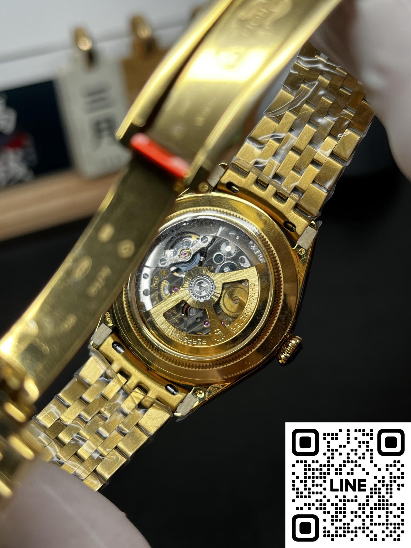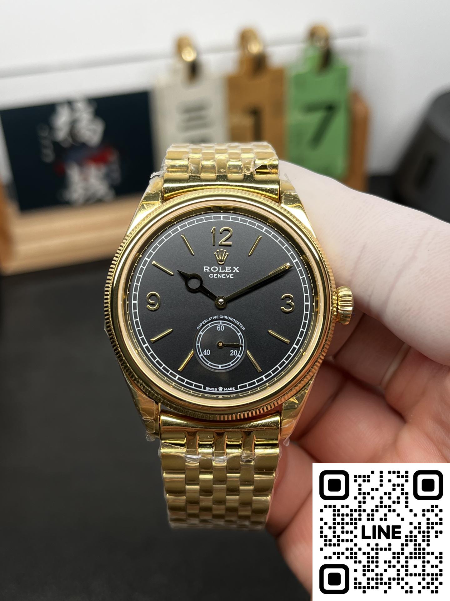 ちらの時計は、R+Factoryの新作、超薄型90gの配重版二針半ビジネスモデルです。モデル名は、ロレックスの恒動1908型で、サイズは39mm✖️9.8mmと非常にエレガントで洗練されたデザインとなっています。本モデルには、独自にカスタマイズされたChronergy擒縱システムが搭載され、さらにブルーSyloxiヒゲゼンマイを採用したCal.7140自動巻きムーブメントを採用しています。これにより、非常に高い精度と耐久性を実現しています。また、K金のスチール印象を再現した折りたたみ式のバックルが装備され、手元にぴったりとフィットします。さらに、K金の質感と手に持った時の重さをよりリアルに感じることができるため、プレミアムな時計の本物の感触をお楽しみいただけます。ビジネスシーンやカジュアルな装いにも合わせやすい洗練されたデザインのこの時計は、持つ人に確かな品格を与える一品です。