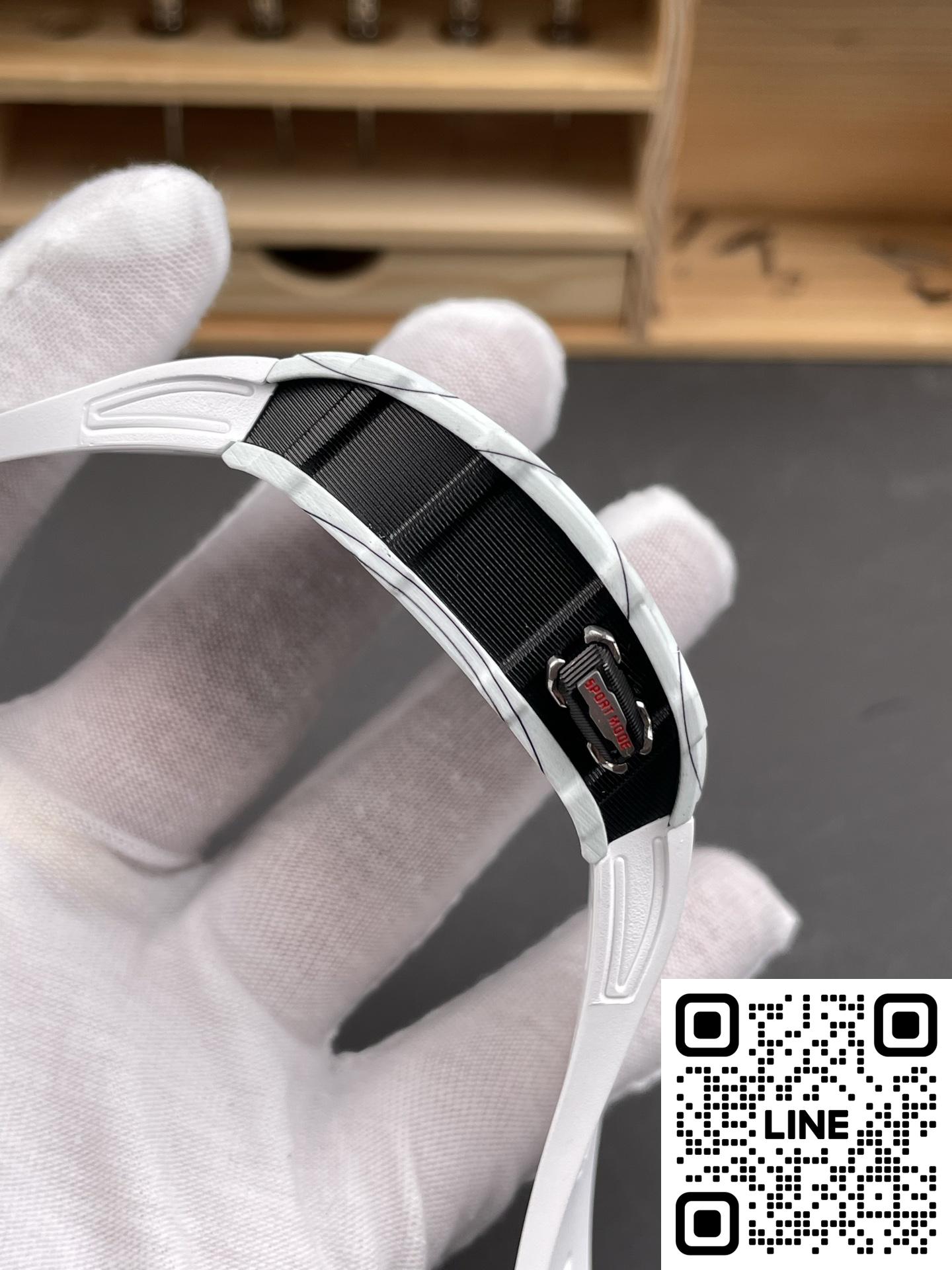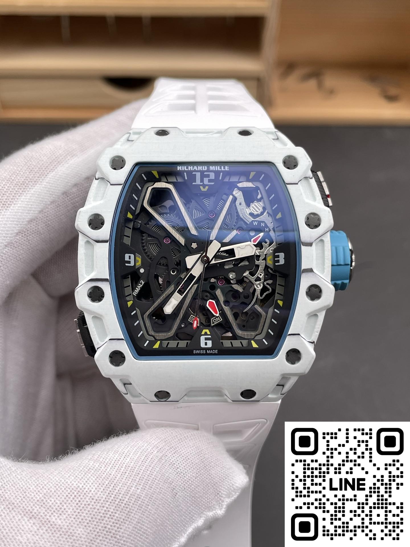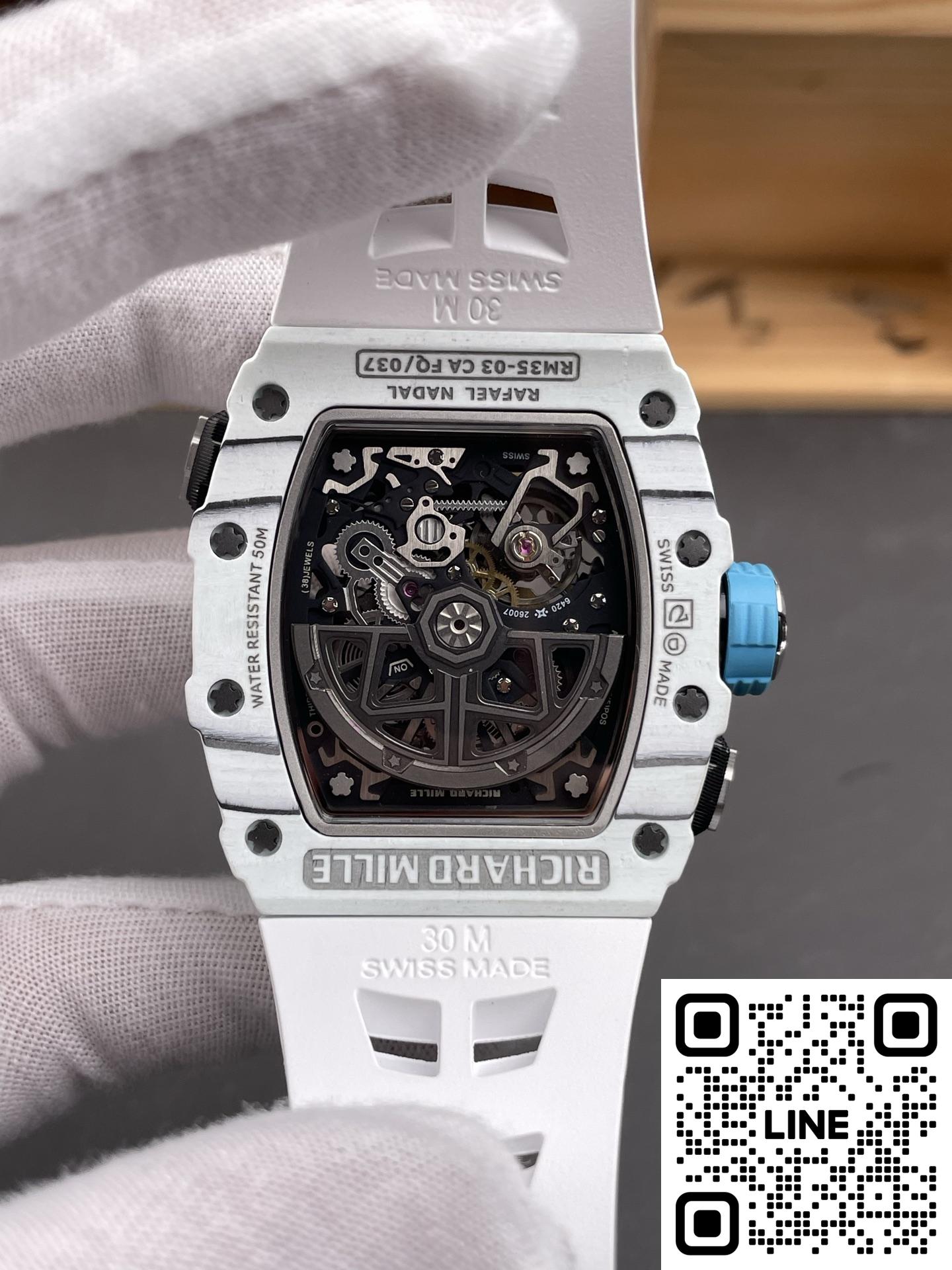 こちらはRM35-03 CA FQ オートマティック ラファエル・ナダルです。開発に3年を費やしたRM035コレクションの第4弾となるこちらのモデルは、「バタフライローター」と名付けられた新しい巻き上げ機構を搭載しています。特許済みのこの装置により、自動巻きムーブメントの巻き上げをユーザーが直接コントロールすることが可能になりました。どんな状況でもユーザーと時計が一体となる、画期的な機能です。ミドルケースはカーボンTPT®。ベゼルはホワイトクオーツTPT®で、表面に見られる複雑な縞模様はクォーツファイバーを分離して得た並列の繊維層が何枚も重ねられることで独特の表情を湛えるリシャール・ミル独自の素材です。ムーブメントはキャリバー RMAL2。表からでも裏からでも、その美しいキャリバーを眺められるようスケルトン仕様になっております。独創的な雰囲気を楽しめる最先端なラグジュアリーなタイムピースです。