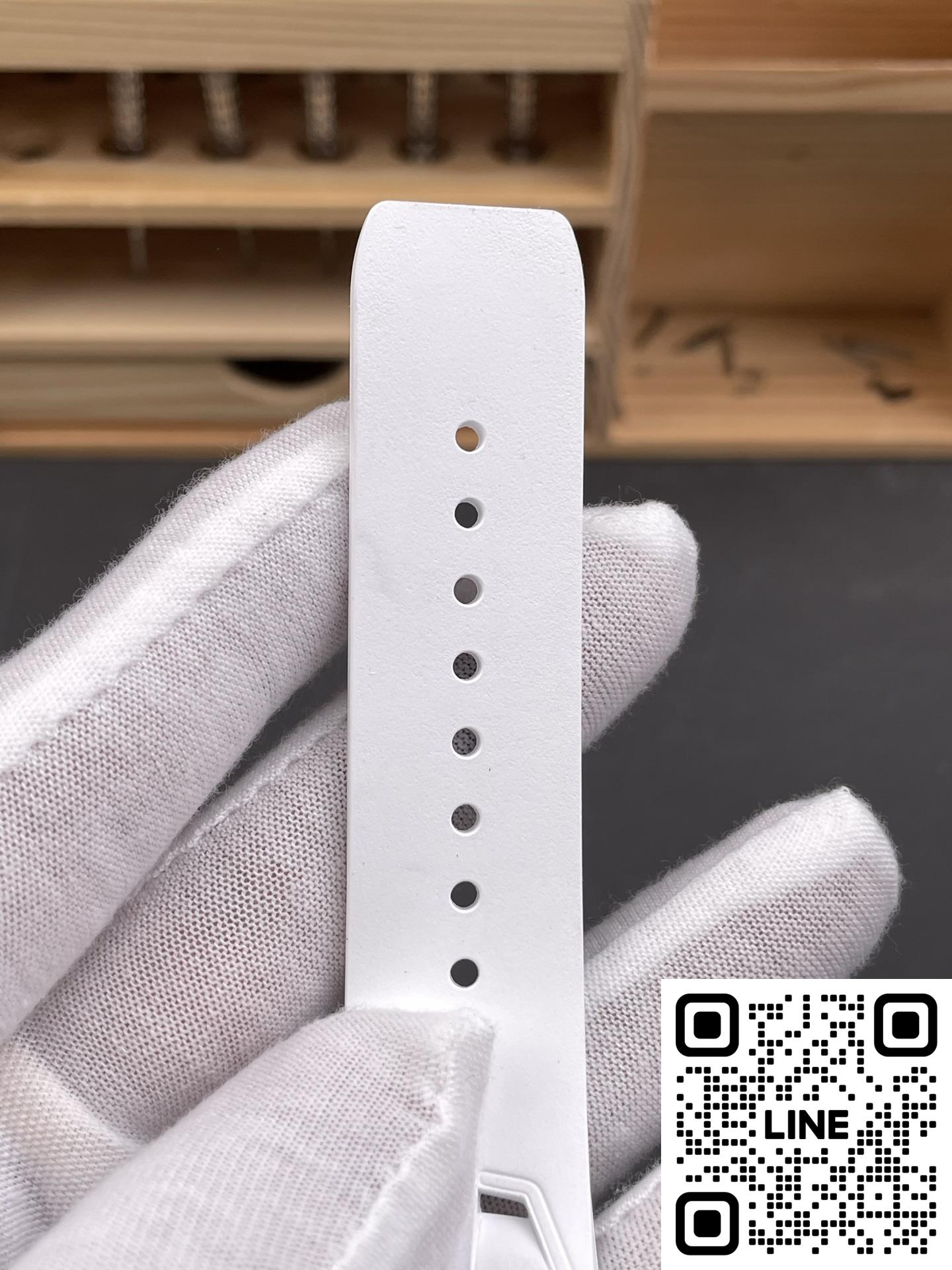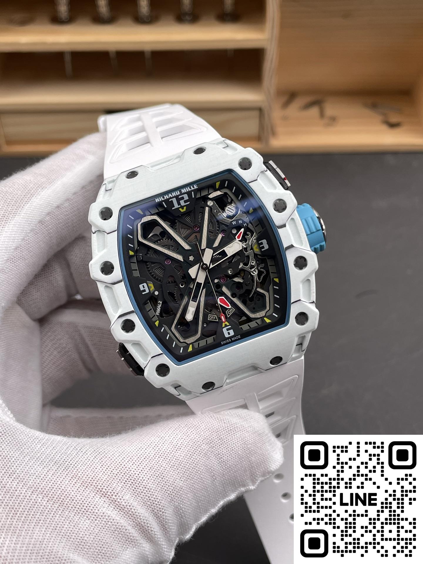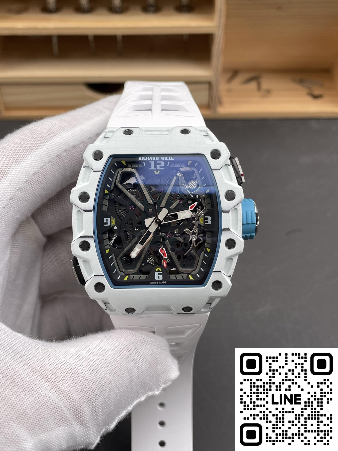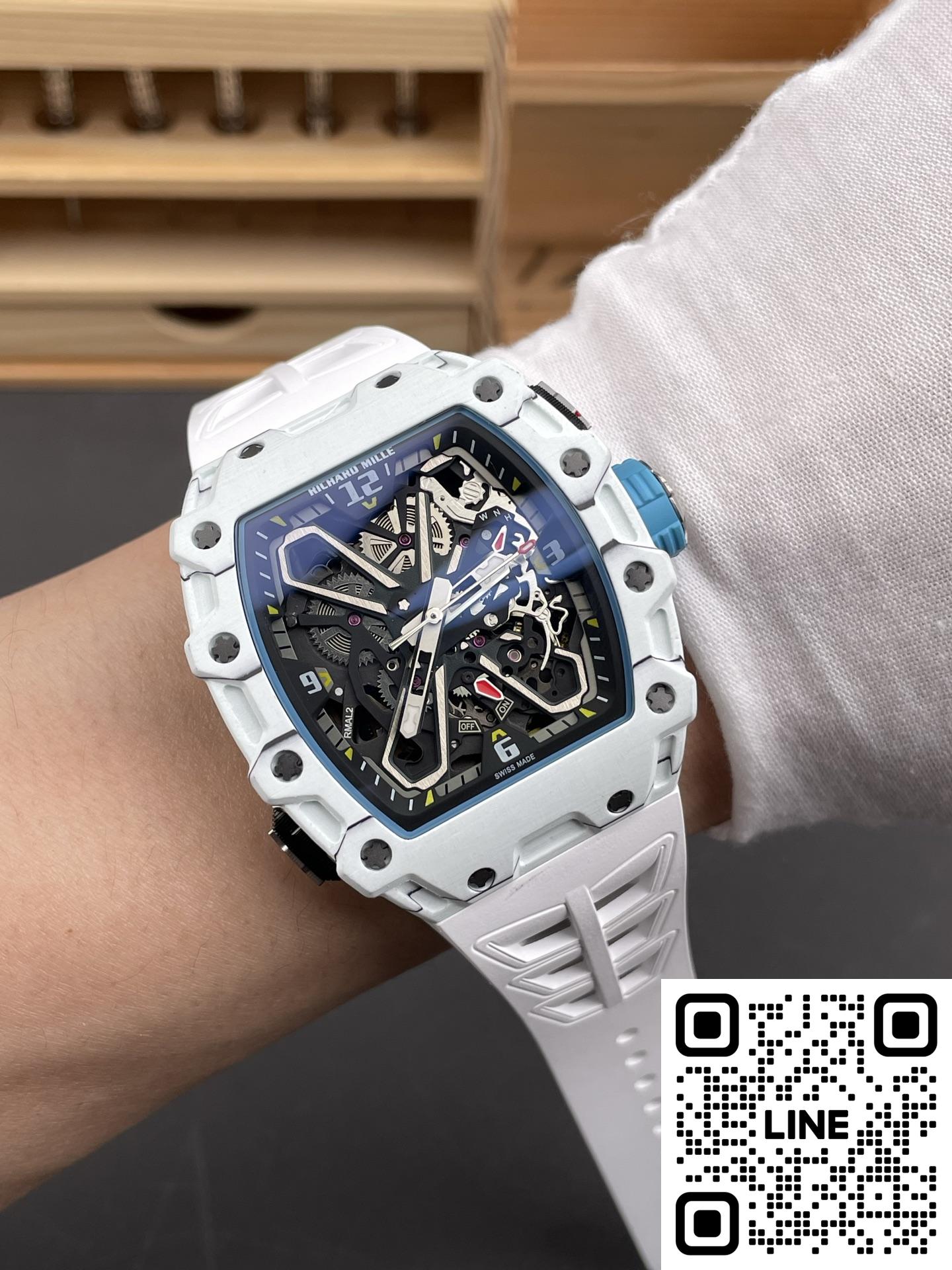 こちらはRM35-03 CA FQ オートマティック ラファエル・ナダルです。開発に3年を費やしたRM035コレクションの第4弾となるこちらのモデルは、「バタフライローター」と名付けられた新しい巻き上げ機構を搭載しています。特許済みのこの装置により、自動巻きムーブメントの巻き上げをユーザーが直接コントロールすることが可能になりました。どんな状況でもユーザーと時計が一体となる、画期的な機能です。ミドルケースはカーボンTPT®。ベゼルはホワイトクオーツTPT®で、表面に見られる複雑な縞模様はクォーツファイバーを分離して得た並列の繊維層が何枚も重ねられることで独特の表情を湛えるリシャール・ミル独自の素材です。ムーブメントはキャリバー RMAL2。表からでも裏からでも、その美しいキャリバーを眺められるようスケルトン仕様になっております。独創的な雰囲気を楽しめる最先端なラグジュアリーなタイムピースです。