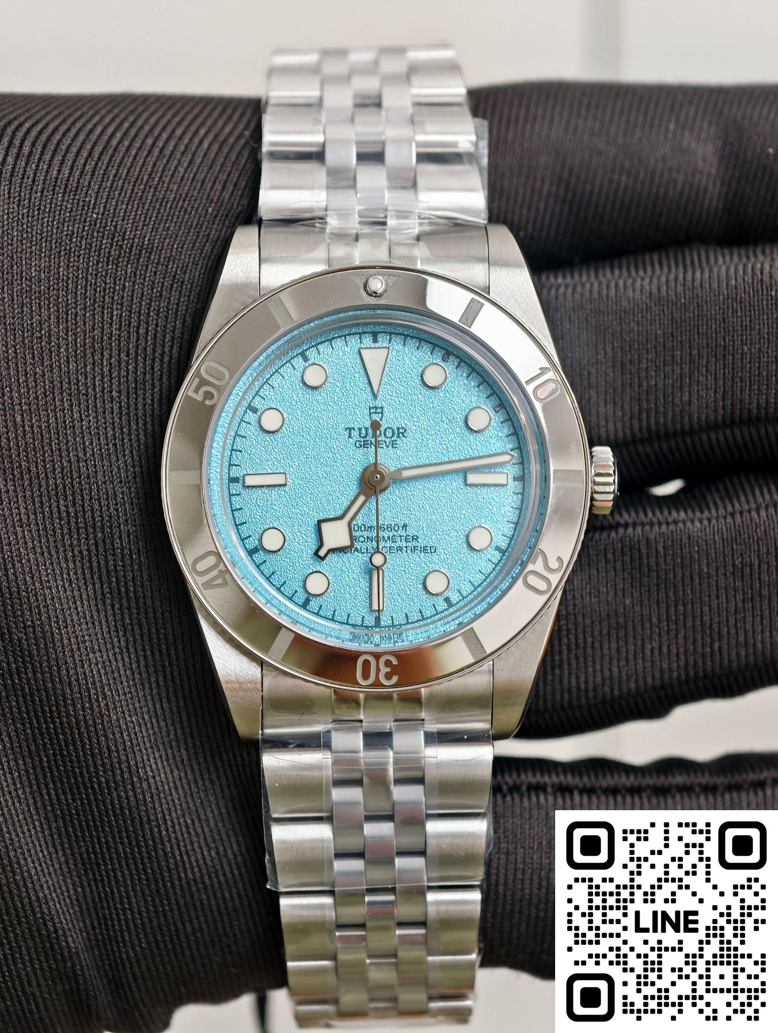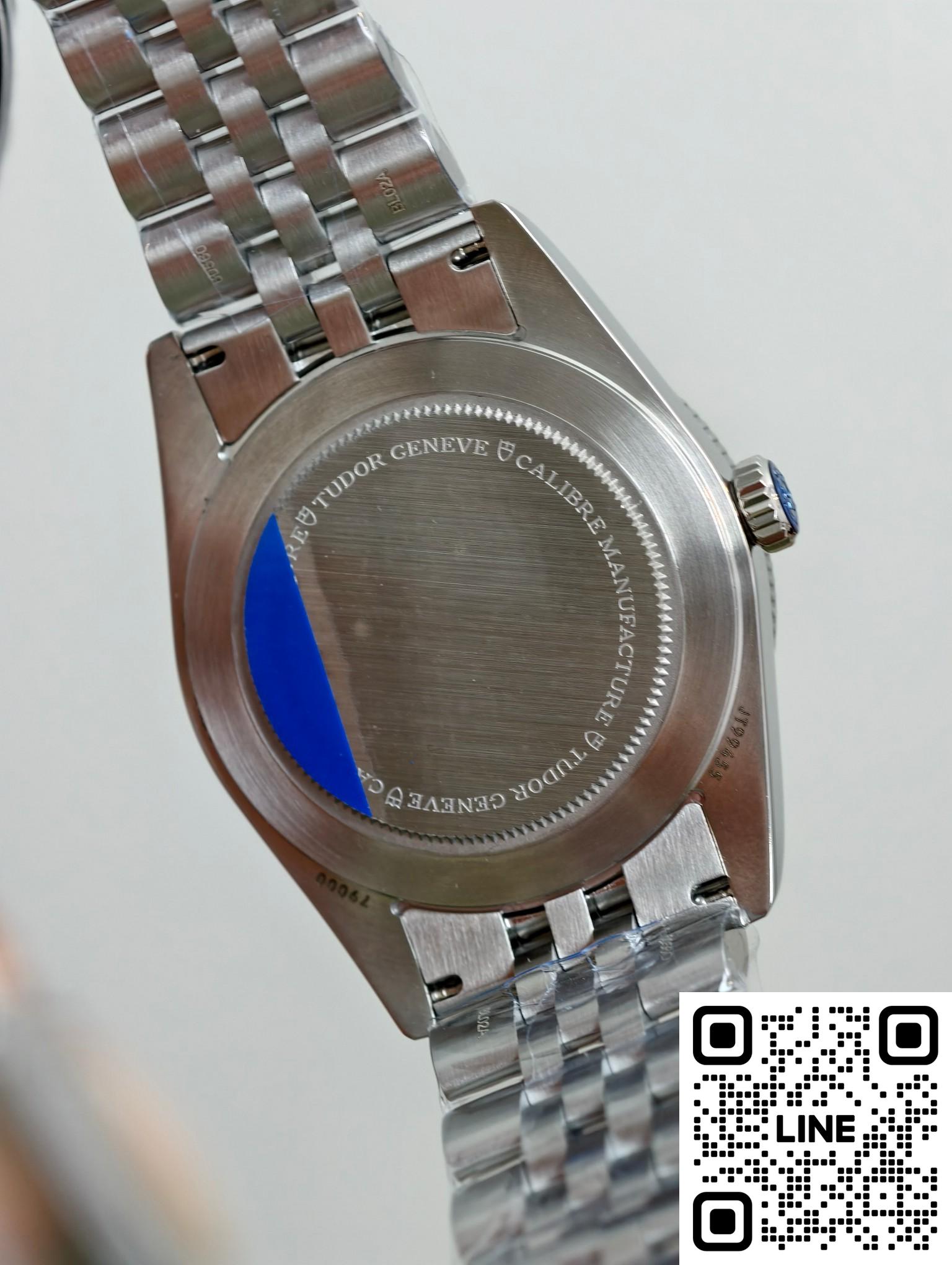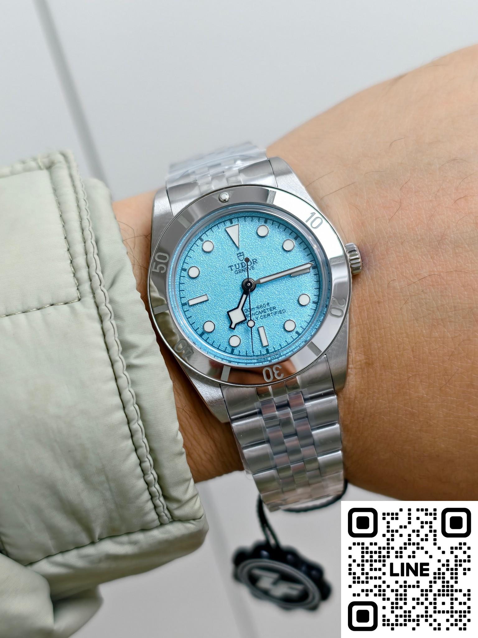 チューダー79000は、ポリッシュ仕上げとブラッシュ仕上げのステンレススチールケースを採用しています。熱帯の海の色にインスピレーションを得たこの特別バージョンは、「ラグーンブルー」と名付けられています。砂のような質感の「ラグーンブルー」文字盤、5連リンクブレスレット、そして鏡面研磨されたベゼルが特徴です。37mmのケース径は1950年代のダイバーズウォッチのクラシックなプロポーションを再現し、11.2mmの薄さが快適な着け心地を実現します。ねじ込み式リューズにはチューダーローズのエンボス加工が施され、ステンレススチール製の逆回転防止ベゼルが組み合わされています。200m防水性能を備え、ヴィンテージスタイルを保ちながら、日常の作業や浅い潜水にも快適に対応し、実用性とスタイルを兼ね備えています。ステンレススチール製の5連ブレスレットはダブルポリッシュ仕上げで、繊細な手触りと快適な装着感を提供します。チューダーT-フィットバックルはマルチポジションの微調整が可能で、素手でもダイビングスーツとの組み合わせでも快適に着用できます。堅牢で耐久性の高いブレスレット構造は、毎日の通勤に特別なケアを必要としません。ケースと素材が調和し、耐久性と装着感を両立した統一感のあるスタイルを実現しています。