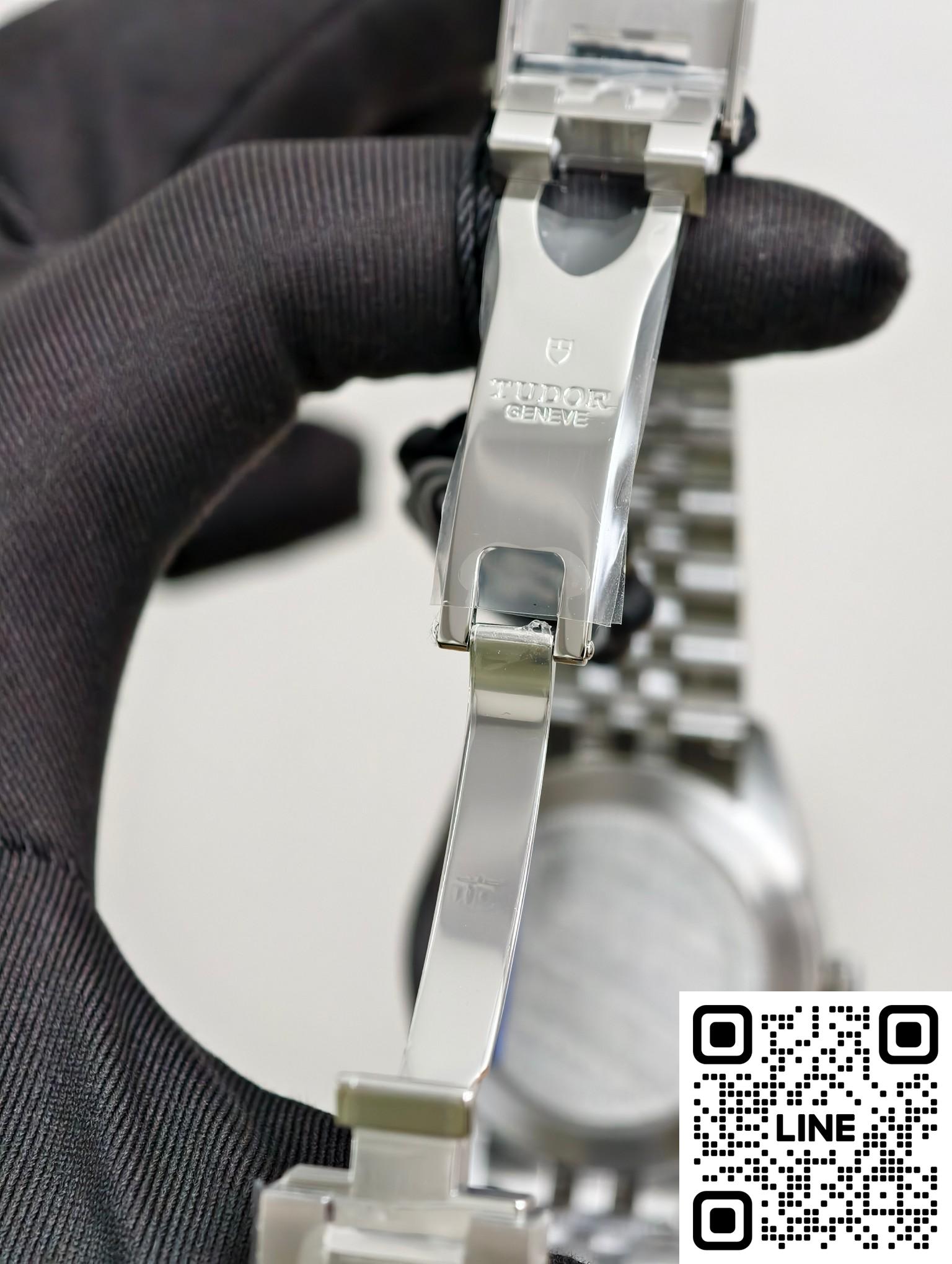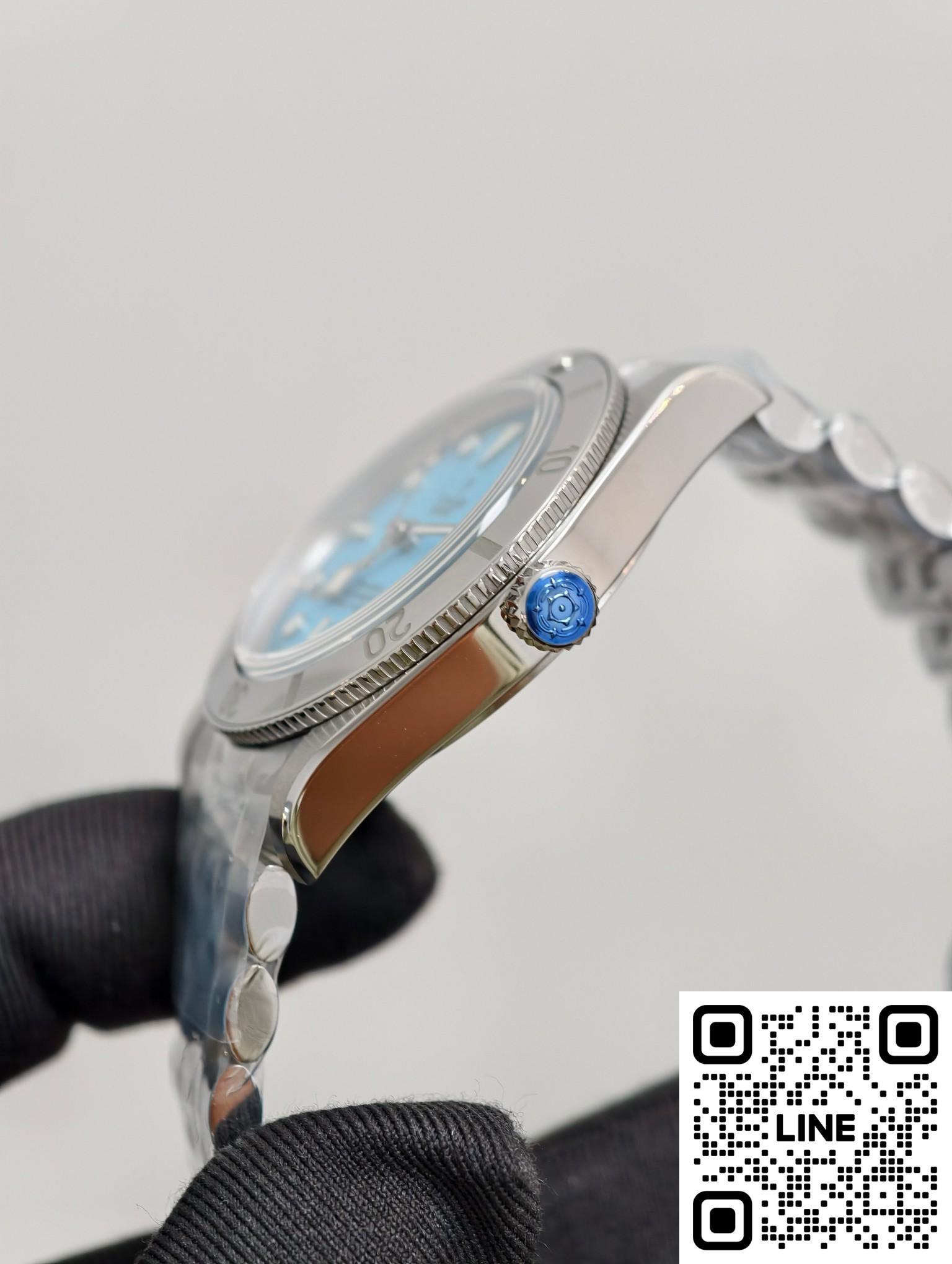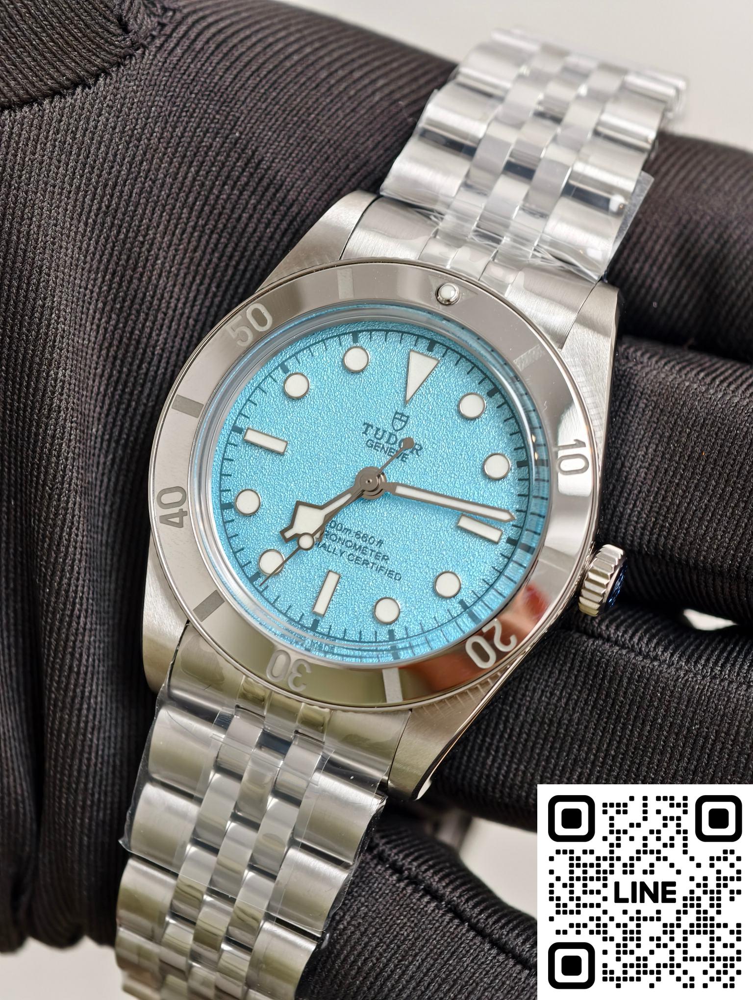 チューダー79000は、ポリッシュ仕上げとブラッシュ仕上げのステンレススチールケースを採用しています。熱帯の海の色にインスピレーションを得たこの特別バージョンは、「ラグーンブルー」と名付けられています。砂のような質感の「ラグーンブルー」文字盤、5連リンクブレスレット、そして鏡面研磨されたベゼルが特徴です。37mmのケース径は1950年代のダイバーズウォッチのクラシックなプロポーションを再現し、11.2mmの薄さが快適な着け心地を実現します。ねじ込み式リューズにはチューダーローズのエンボス加工が施され、ステンレススチール製の逆回転防止ベゼルが組み合わされています。200m防水性能を備え、ヴィンテージスタイルを保ちながら、日常の作業や浅い潜水にも快適に対応し、実用性とスタイルを兼ね備えています。ステンレススチール製の5連ブレスレットはダブルポリッシュ仕上げで、繊細な手触りと快適な装着感を提供します。チューダーT-フィットバックルはマルチポジションの微調整が可能で、素手でもダイビングスーツとの組み合わせでも快適に着用できます。堅牢で耐久性の高いブレスレット構造は、毎日の通勤に特別なケアを必要としません。ケースと素材が調和し、耐久性と装着感を両立した統一感のあるスタイルを実現しています。